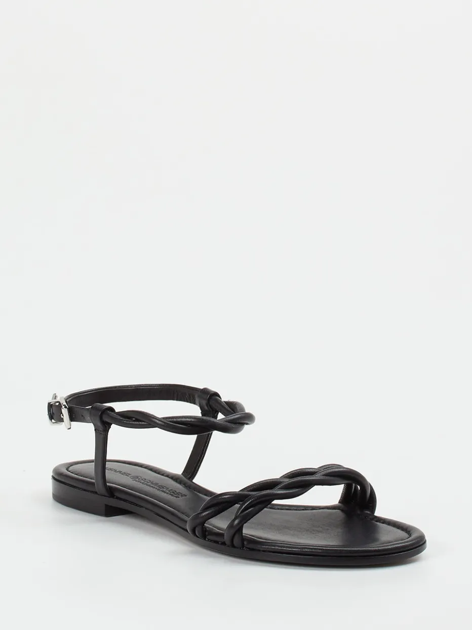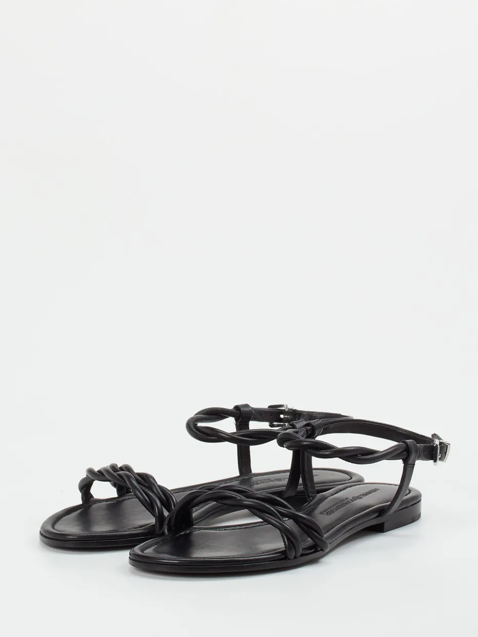 Die geflochtene Riemchensandale aus schwarzem Lammleder verbindet zeitlose Eleganz mit mediterran-minimalistischem Design. Hochwertige Materialien und dezente Details sorgen für stilvollen Komfort.