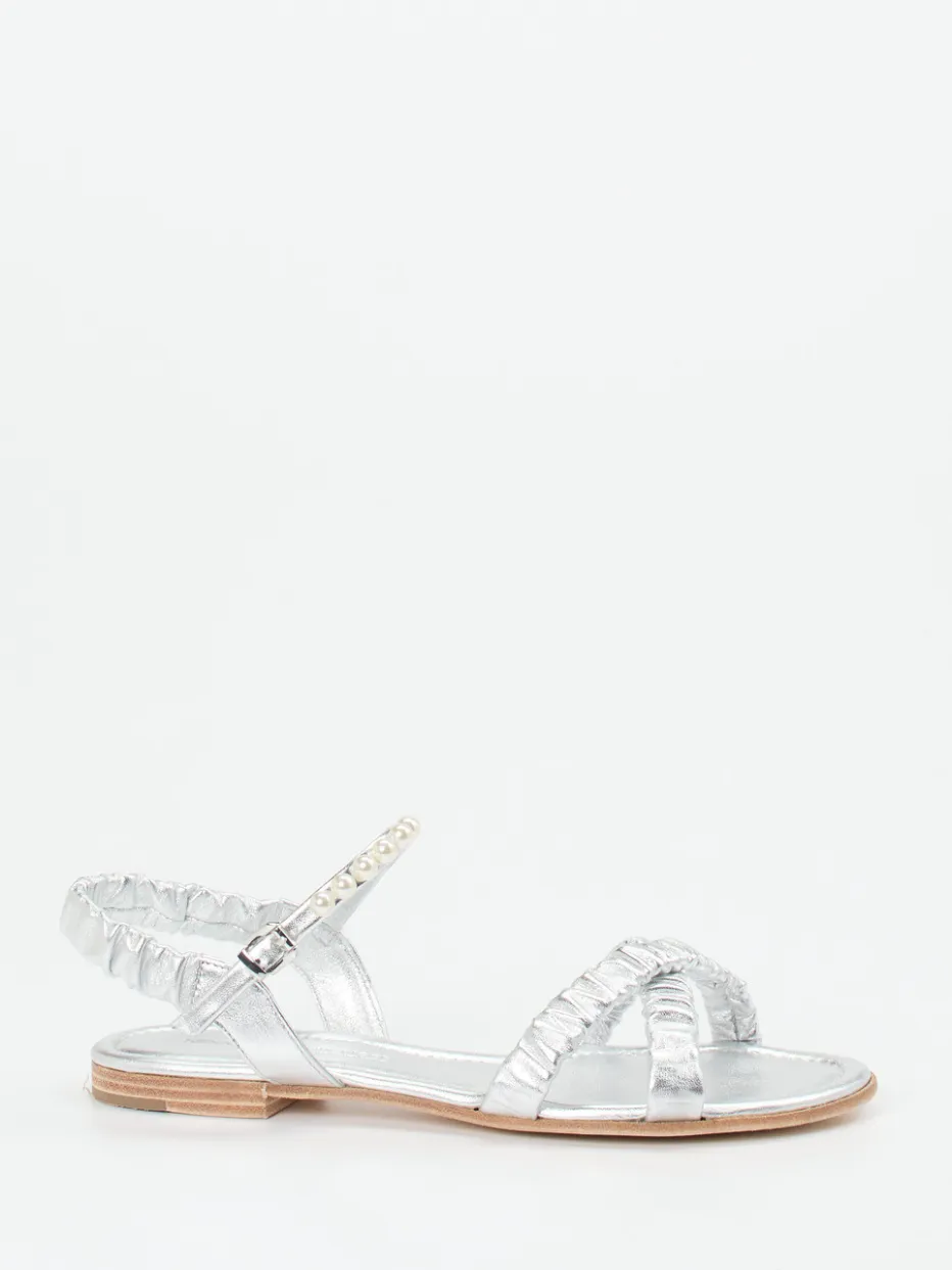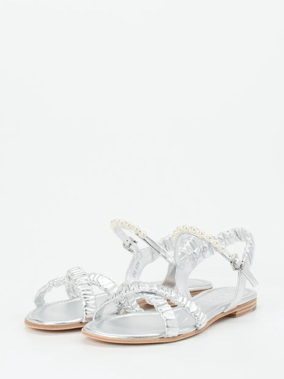 Ideal für festliche Anlässe oder den stilvollen Strandspaziergang überzeugt das Modell durch hochwertiges Metallicleder in silbernem Schimmer. Leicht geraffte Riemchen und ein Perlenbesatz setzen romantische Akzente. Der offene, flache Aufbau bietet luftigen Komfort, unterstützt durch eine weich gepolsterte Ledersohle. Fersen- und Knöchelriemen mit silberfarbener Dornschließe sorgen für sicheren Halt. Im Trend liegen Metallic-Akzente und Perlverzierungen gleichermaßen. Lässt sich perfekt zu pastellfarbenen Sommerkleidern oder Metallic-Accessoires kombinieren.