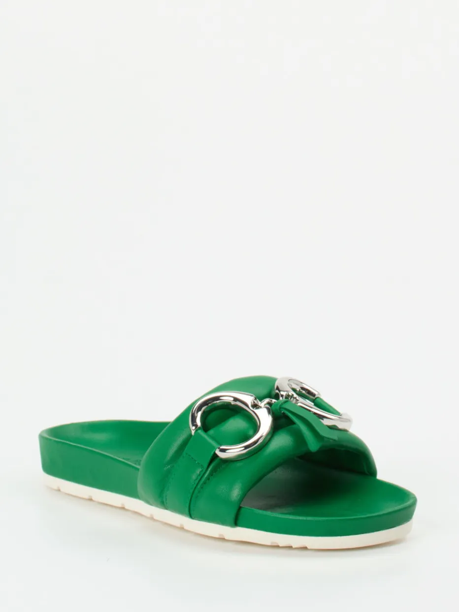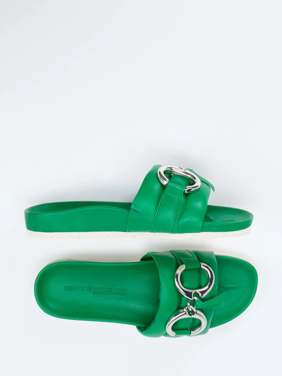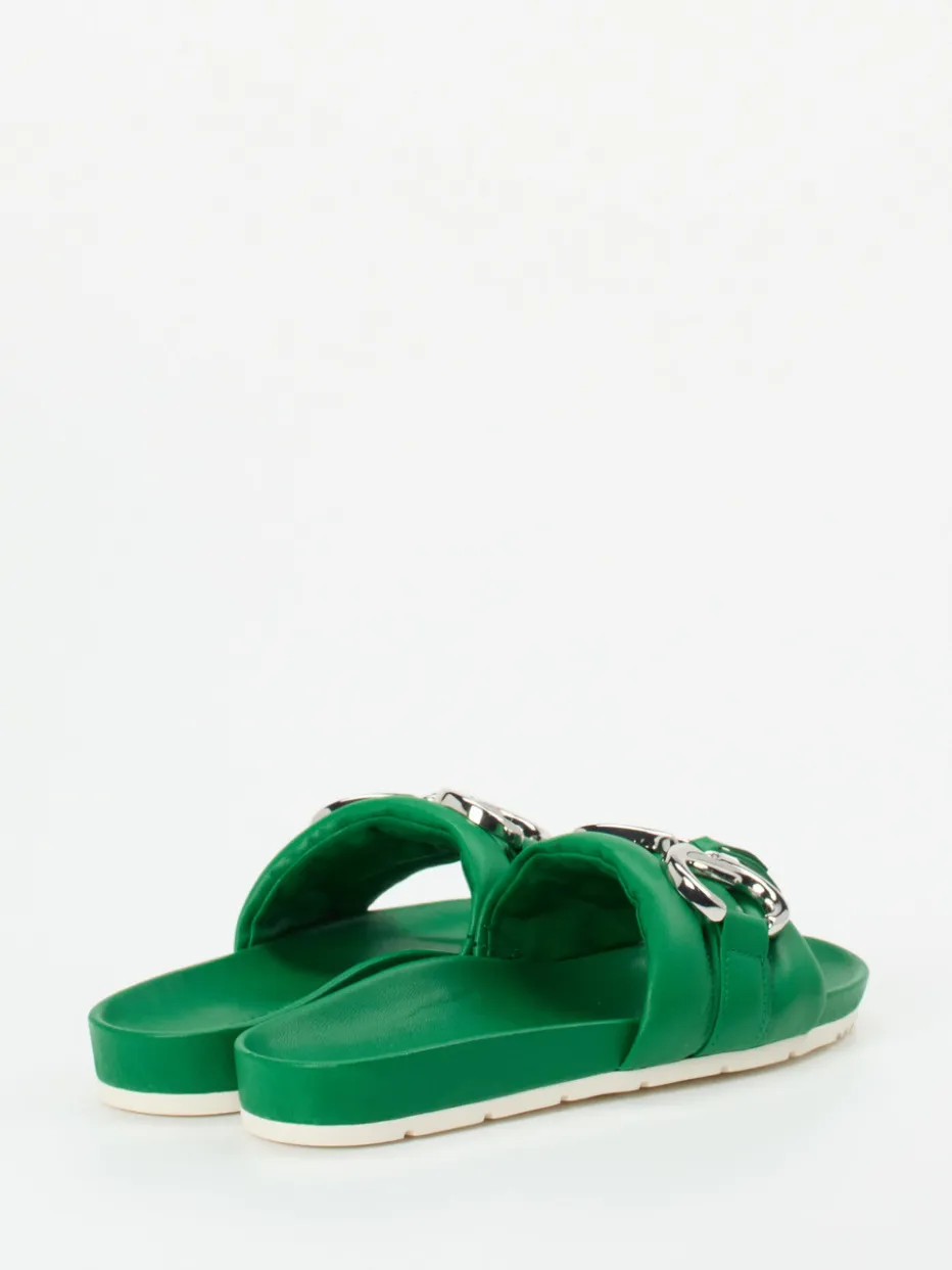 Diese Pantolette vereint hochwertigen Komfort mit einem modischen Statement – das smaragdgrüne Lammleder und die silberne Zierschnalle unterstreichen einen urbanen Sommerstil.
