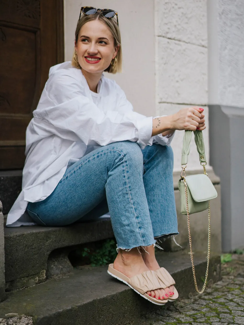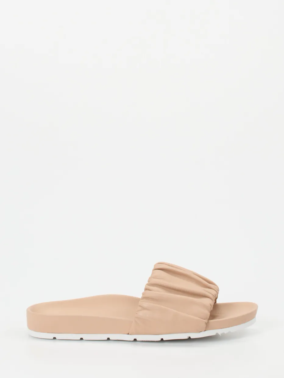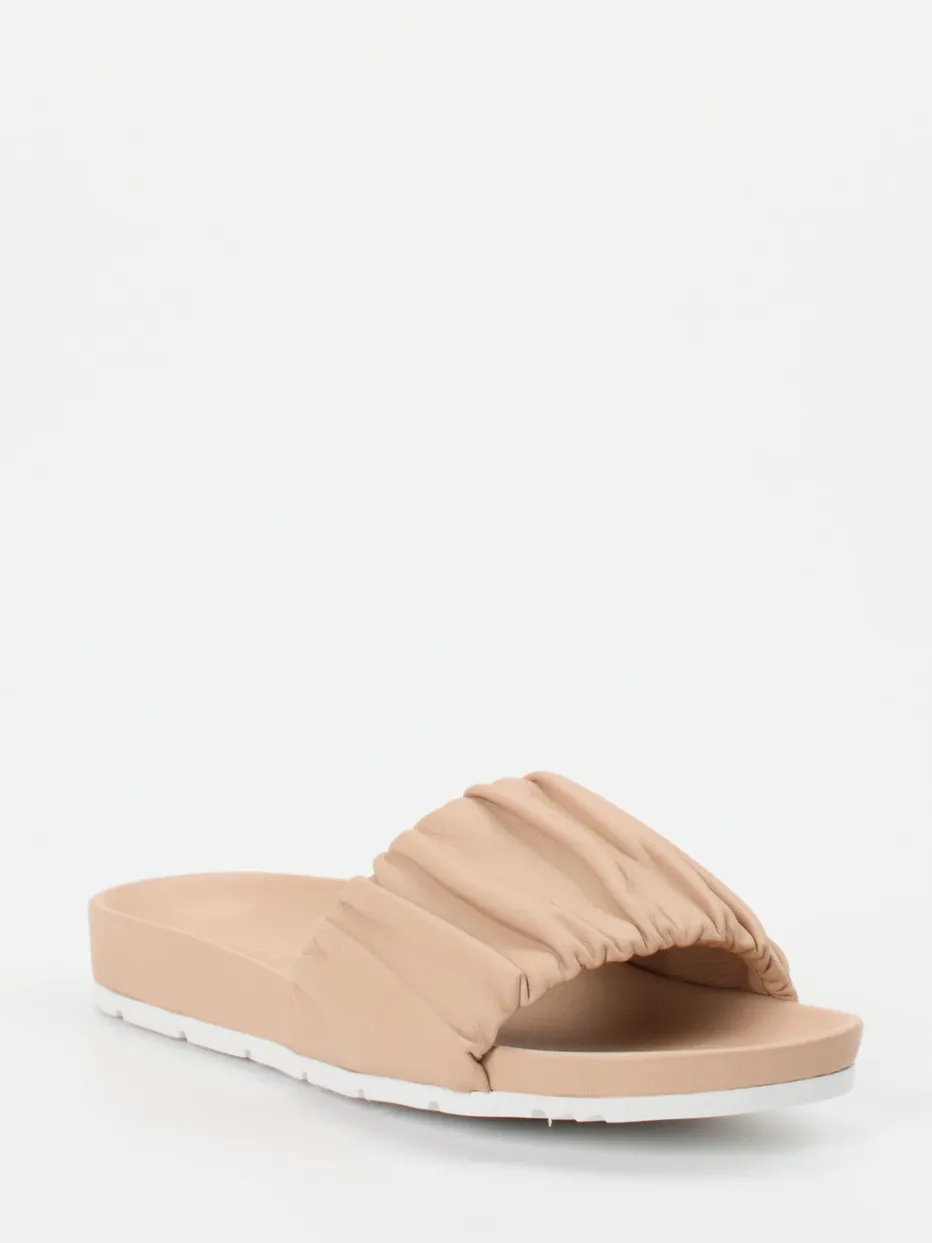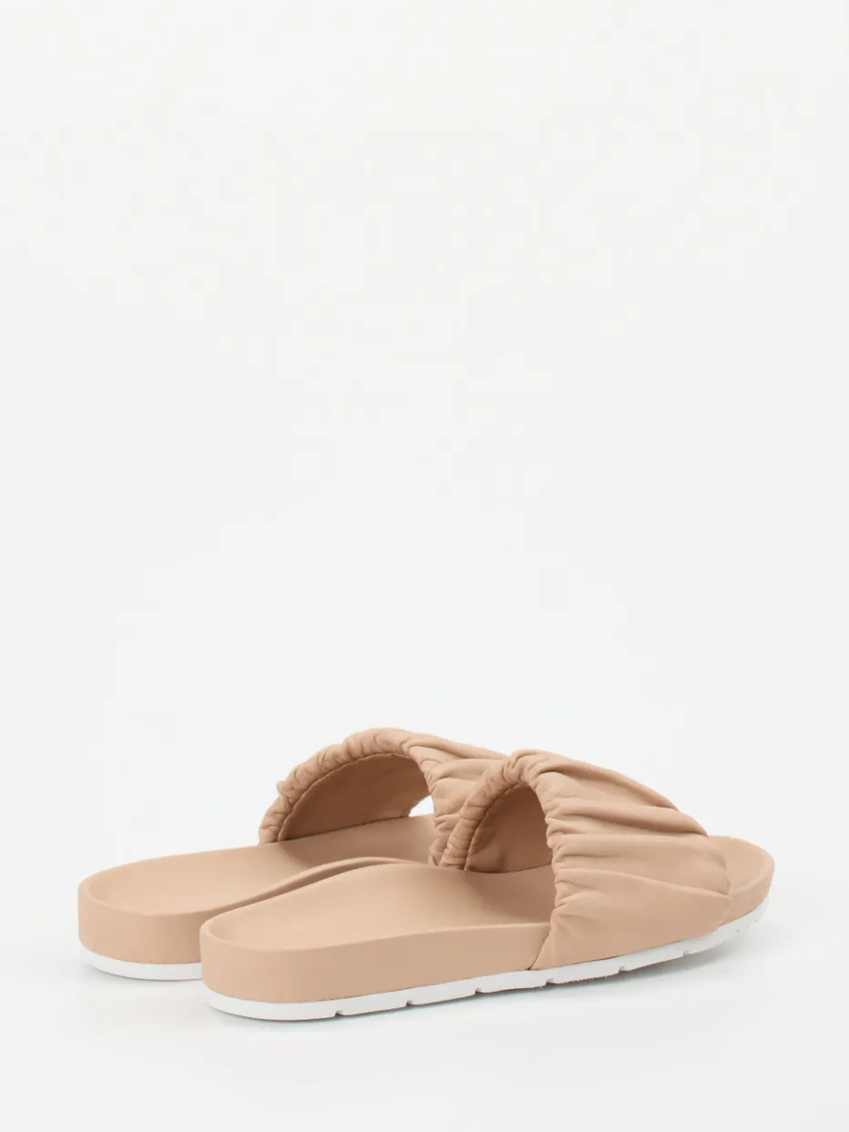 Perfekt für entspannte Sommertage in der Stadt, bieten diese beigefarbenen Slides aus feinem Lammleder angenehme Haptik und hohen Tragekomfort. Der voluminös geraffte, gepolsterte Riemen akzentuiert die schlichte, offene Silhouette mit modischer Leichtigkeit. Die weiße, profilierte Gummisohle sorgt für sicheren Halt – selbst auf glatten Oberflächen. Inspiriert vom „Quiet Luxury“-Trend passen sie ideal zu Leinenhosen oder Denim-Shorts.