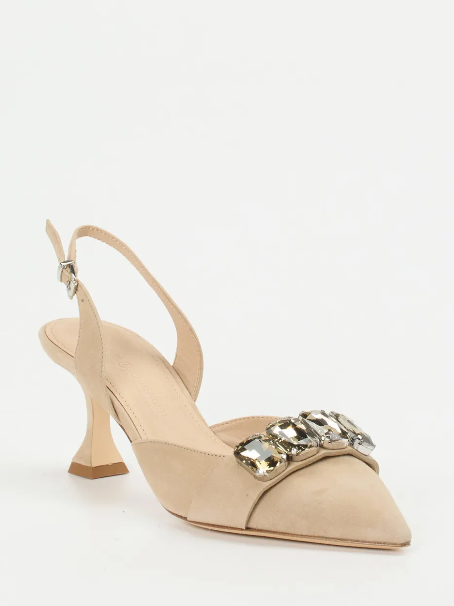 Die edlen Slingback-Pumps verbinden samtig weiches Veloursleder mit auffälliger Kristallverzierung – ein stilvoller Akzent für besondere Anlässe.