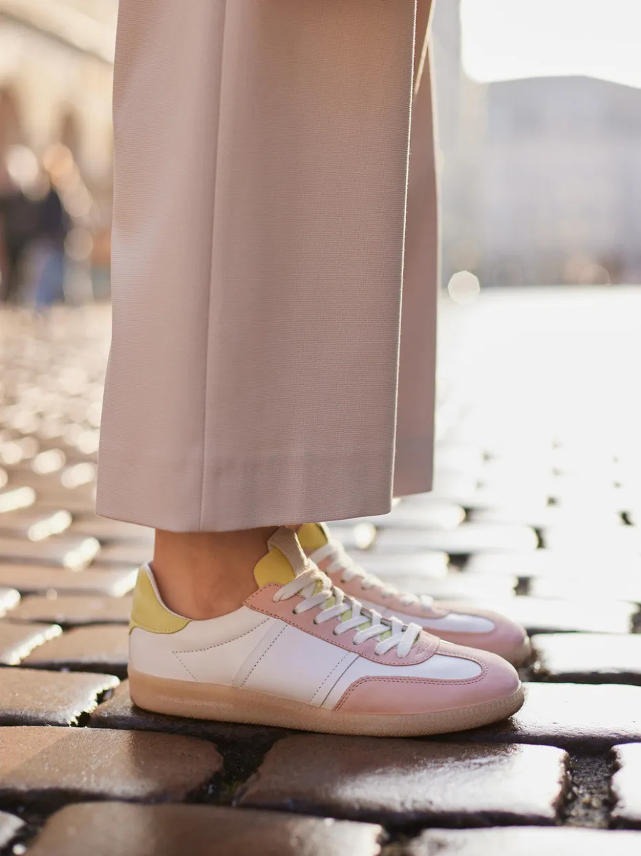 Ob beim Stadtbummel oder auf dem Weg ins Café: Die Kombination aus weißem Kalbleder und soft angeschliffenem Nubukleder in Rosé und Pastellgelb wirkt stilvoll und trendbewusst zugleich. Die klassische, flache Silhouette, dezente Ton-in-Ton-Nähte und farbige Overlays betonen den Retro-Charakter. Eine gepolsterte Ferse sorgt für angenehmen Komfort, die profilierte Gummisohle bietet sicheren Halt. Der Look ist ideal für das Y2K-Revival und passt zu neutralen Tönen sowie weiten Hosen und Crossbody-Bags in Pastell.