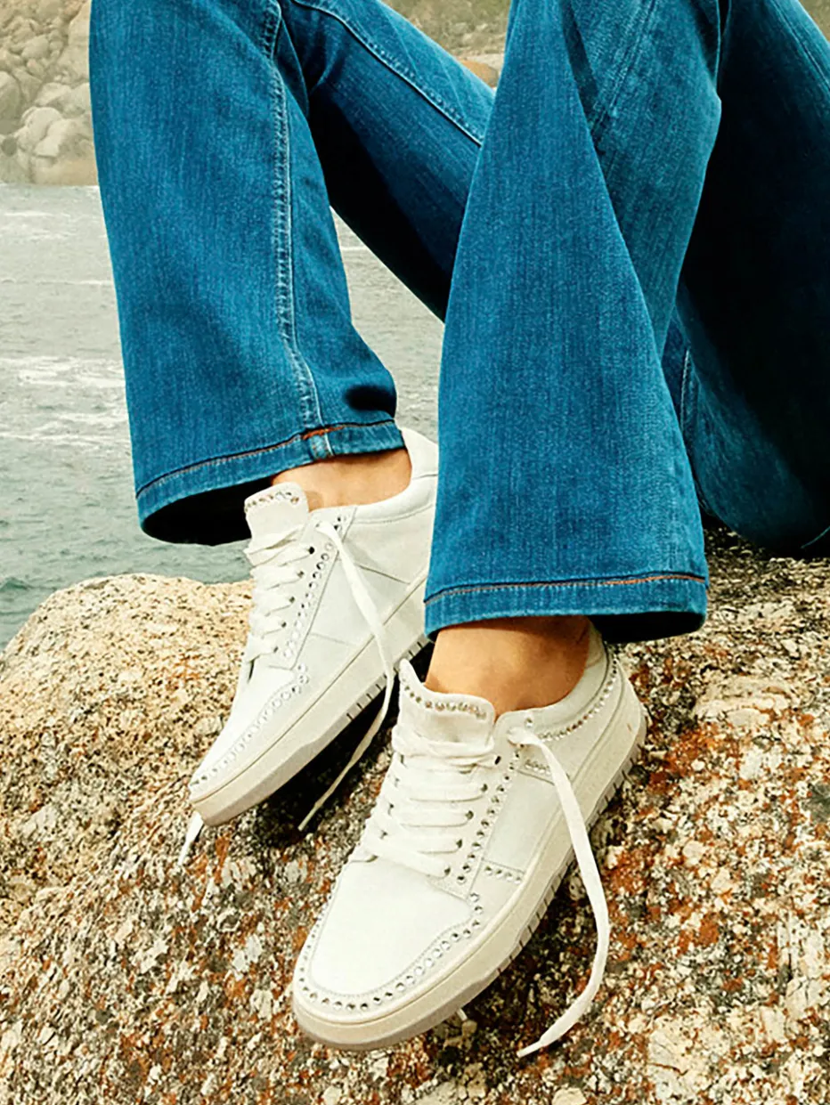 Ideal für entspannte City-Tage oder den stilvollen Auftritt im Urlaub: Dieser Sneaker überzeugt durch einen hochwertigen Materialmix aus Kalbleder und samtig angeschliffenem Veloursleder. Das Design in Off-White mit hellgrauen Nuancen wirkt zurückhaltend und edel, während der umlaufende Strassbesatz entlang der klassischen Silhouette dezente Eyecatcher setzt. Die profilierte Gummisohle mit Markenprägung sorgt für Trittsicherheit und einen sportiven Akzent. Inspiriert vom Minimalismus und aktuellen Crystal-Trends lässt sich der Look bestens zu weißen Jeans oder Pastelltönen kombinieren.