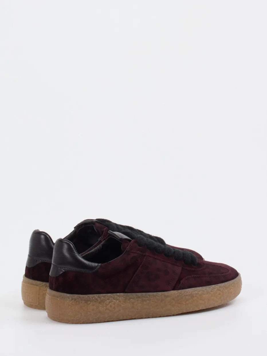 Dieser Sneaker verbindet samtiges Veloursleder in Maulbeerton mit edlem Glattleder und auffälliger Retro-Sohle – ein modisches Statement der ruhigen Extravaganz.