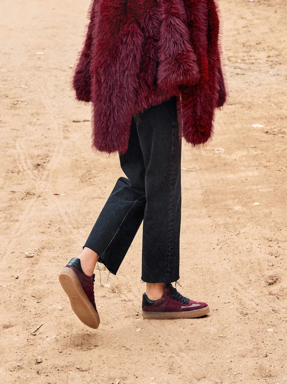 Ob zum Stadtbummel oder für stylishe Abende – der Sneaker überzeugt mit einer Kombination aus samtigem Velours- und glattem Leder. Die Ton-in-Ton-Nähte und die strukturierte Kreppsohle setzen markante Akzente zum bordeauxroten Obermaterial. Der gepolsterte Einstieg und das hochwertige Lederfutter sorgen für Komfort im Alltagslook. Der Schnürverschluss mit auffälligen schwarzen Bändern unterstreicht die retro-inspirierte Silhouette im Low-Top-Stil. Optimal kombinierbar mit Cordhose oder Oversized Hoodie.