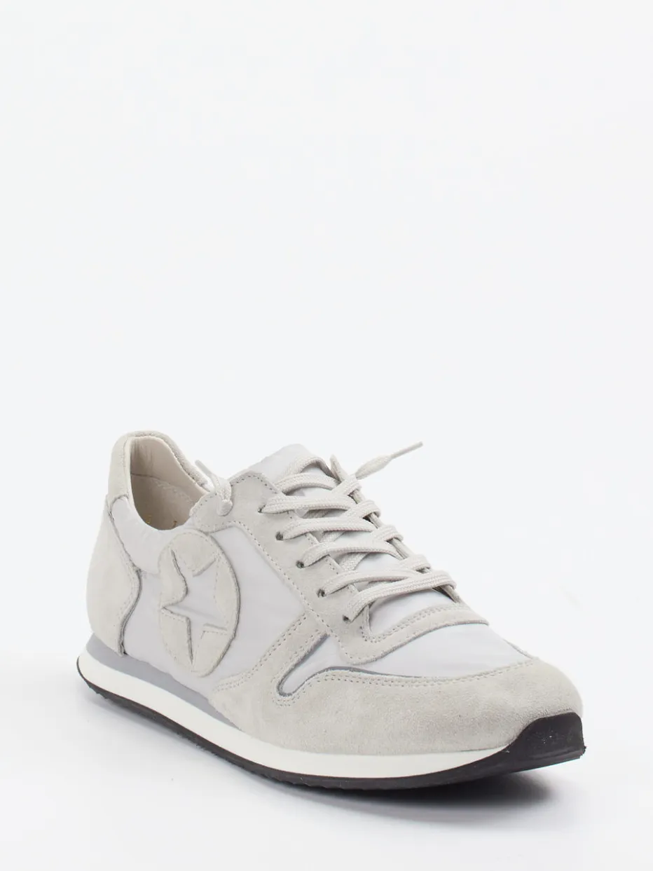 Stilvoller Komfort für entspannte Alltagsmomente.Kennel & Schmenger präsentiert einen modernen Damen-Sneaker im Retro-Stil. Ideal für urbane Freizeitlooks kombiniert dieser Sneaker hellgraues Veloursleder, samtig angeschliffen, mit feinem Textil. Die flache und schmale Silhouette, eine tonal abgestimmte Schnürung sowie die applizierte Stern-Aussparung an der Seite prägen das Design. Die mehrfarbige Gummisohle mit Rillenprofil bietet zuverlässigen Halt und unterstreicht den sportlich-lässigen Charakter. Der gepolsterte Einstieg erhöht den Tragekomfort spürbar. Trendbewusst reiht sich dieses Modell in die Retro Running-Bewegung der Saison SS24 ein und passt perfekt zu soften Streetwear-Looks. Ein ausdrucksstarkes Quiet-Luxury-Piece mit markentypischer Raffinesse.