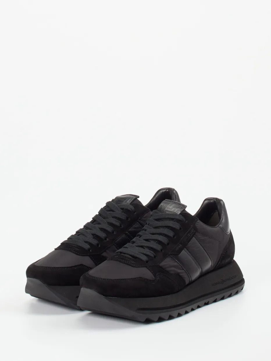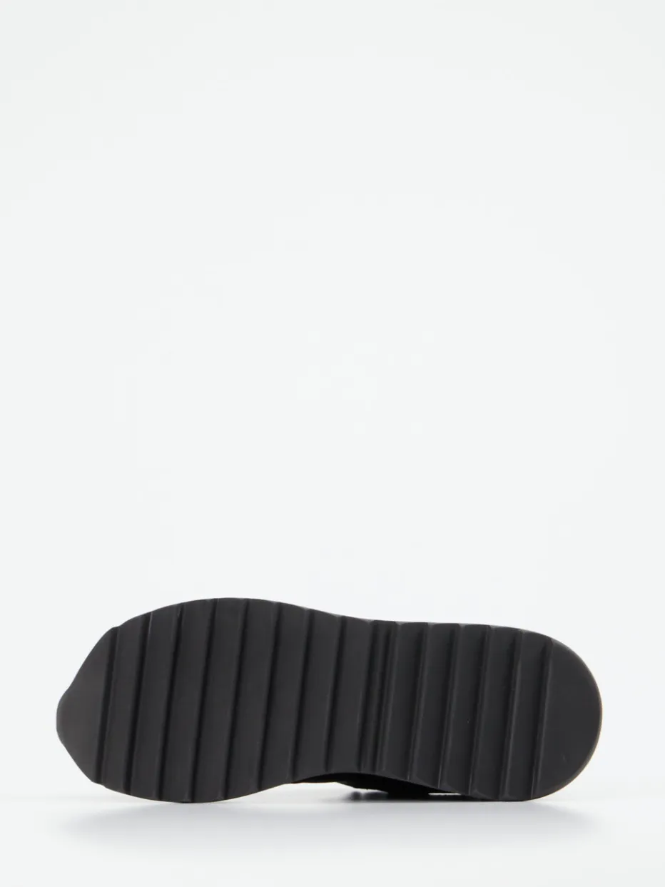 Monochromer Retro-Look neu interpretiert.Der Damen-Sneaker von Kennel & Schmenger zeigt sich in klassischer Retro-Runner-Silhouette mit moderner Note. Die Kombination aus samtig angeschliffenem Veloursleder und tonalem Nylon verleiht dem schwarzen Modell eine hochwertige Haptik mit spannenden Struktureffekten. Die futuristisch anmutende Plateau-Gummisohle mit Zickzack-Profil sorgt für Trittsicherheit und ein charakterstarkes Erscheinungsbild. Dezente Prägung an der Seite und gepolsterte Designelemente betonen das minimalistische Streetwear-Flair. Ideal für monochrome Looks und entspannte Alltagsoutfits mit modischer Kompetenz. Komfort und urbaner Stil – typisch Kennel & Schmenger.