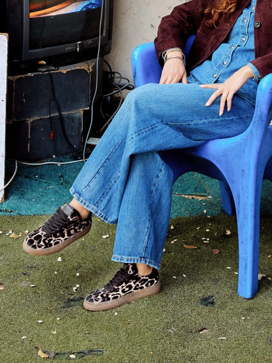 Ein charakterstarker Low-Top-Sneaker mit weich strukturiertem Veloursleder, raffiniertem Leoprint und markanter Plateausohle – trendbewusst und detailverliebt inszeniert.
