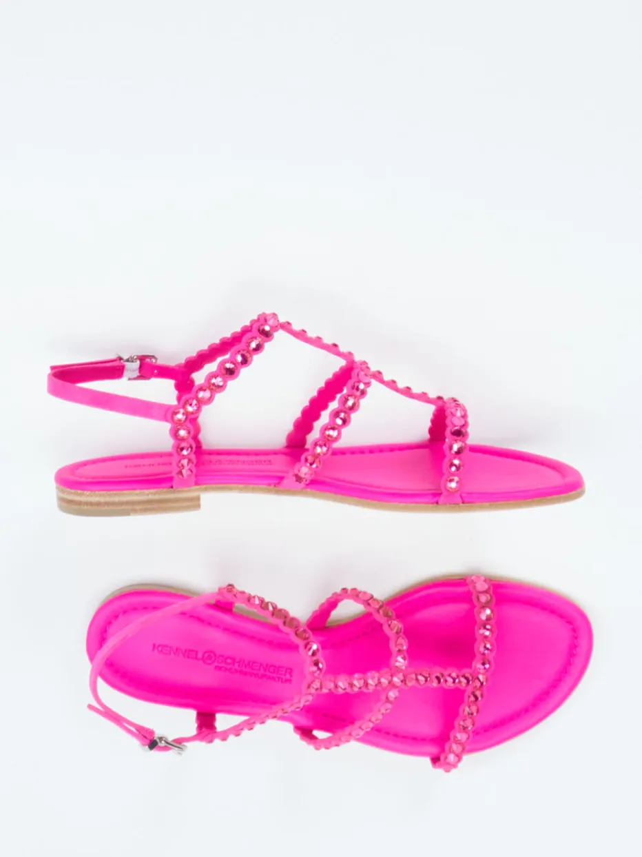 Für Strandtage mit Glam-Faktor.Kennel & Schmenger präsentiert eine feminine Zehentrenner-Sandale für modebewusste Trägerinnen. Die Sandale überzeugt bei sommerlichen Events oder im Urlaub mit ihrem samtigen Veloursleder in leuchtendem Pink. Ton-in-Ton platzierte Strasssteine bringen Glanz in den Look, während die offene, flache Silhouette Alltagstauglichkeit garantiert. Ein verstellbarer Riemen mit silberfarbenem Dornverschluss sorgt gemeinsam mit der gepolsterten Innensohle und der flexiblen Ledersohle für angenehmen Sitz. Glitzernd und trendbewusst fügt sich das Modell in Y2K- und Barbiecore-Styles ein. Zu leichten Sommerkleidern ideal kombinierbar. Perfektionierter Style für glamouröse Casual-Momente – von Kennel & Schmenger.