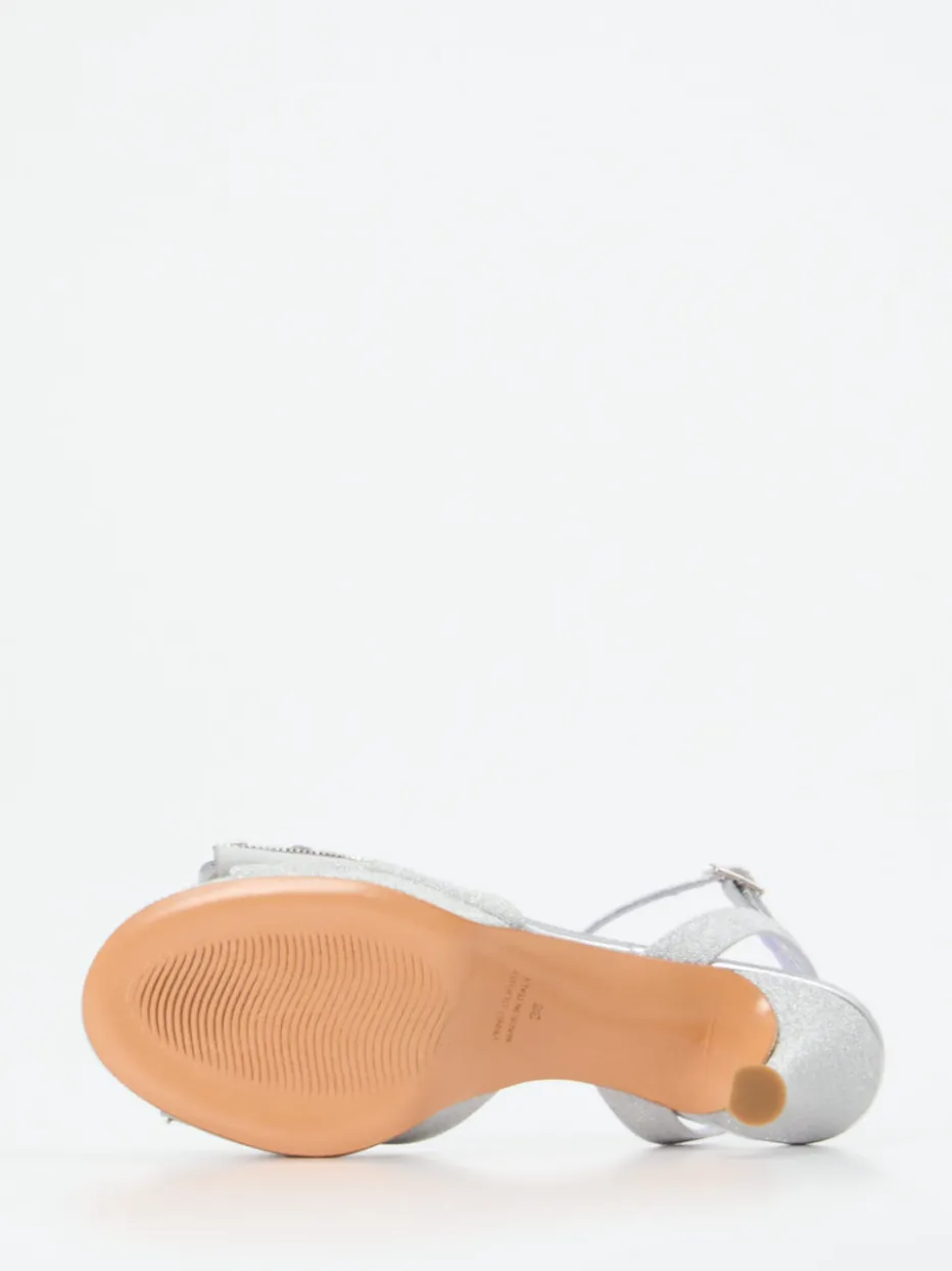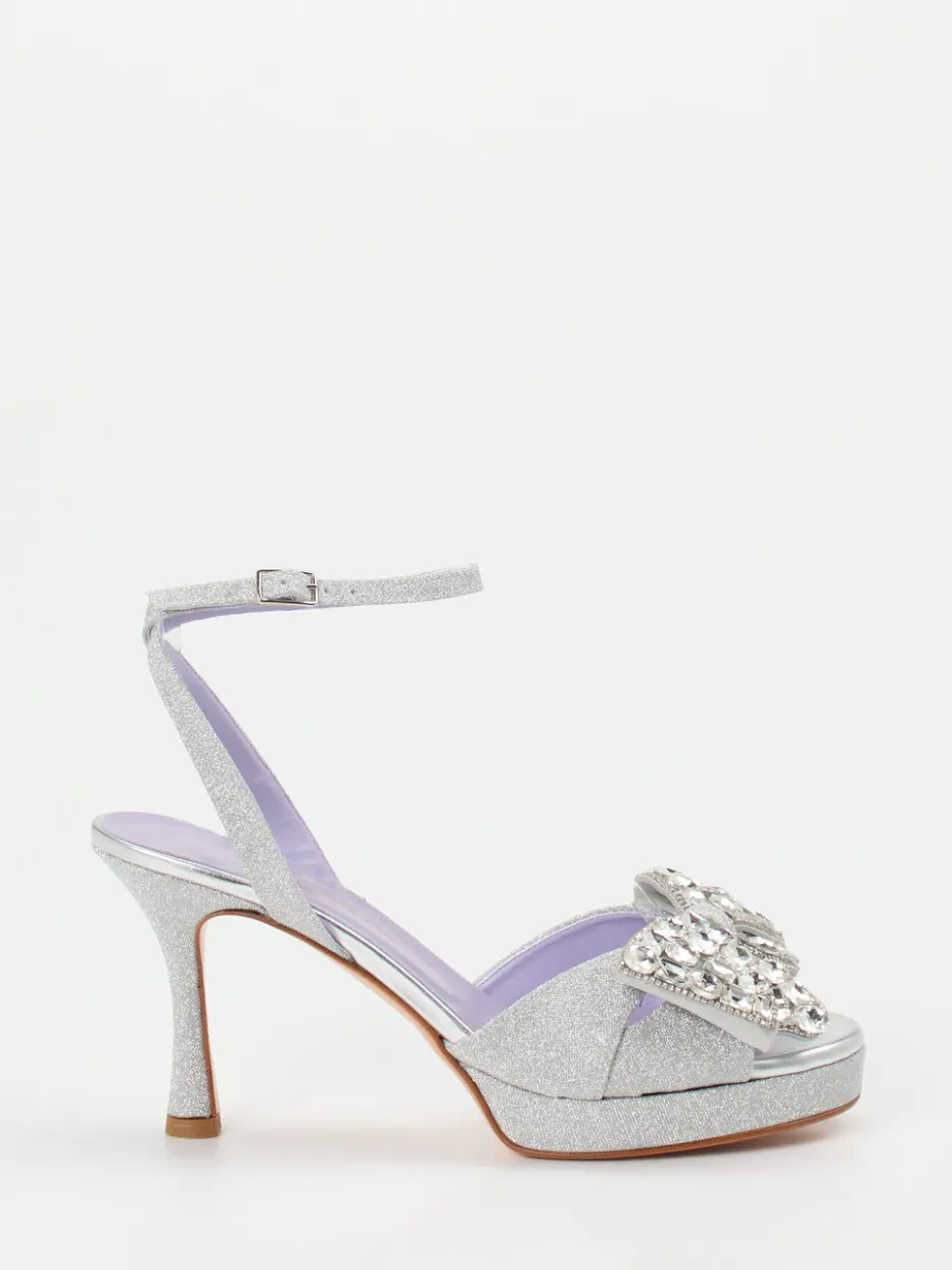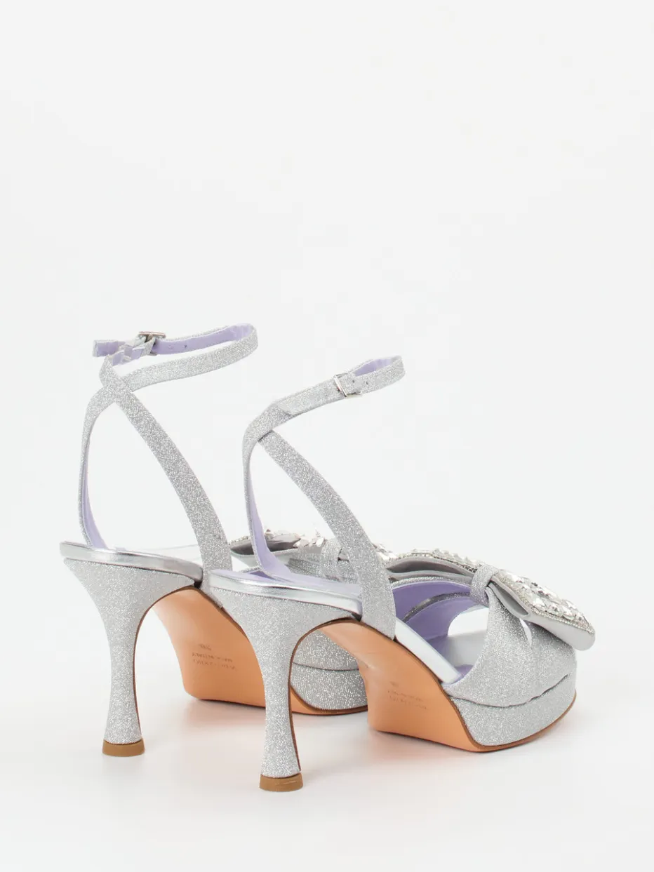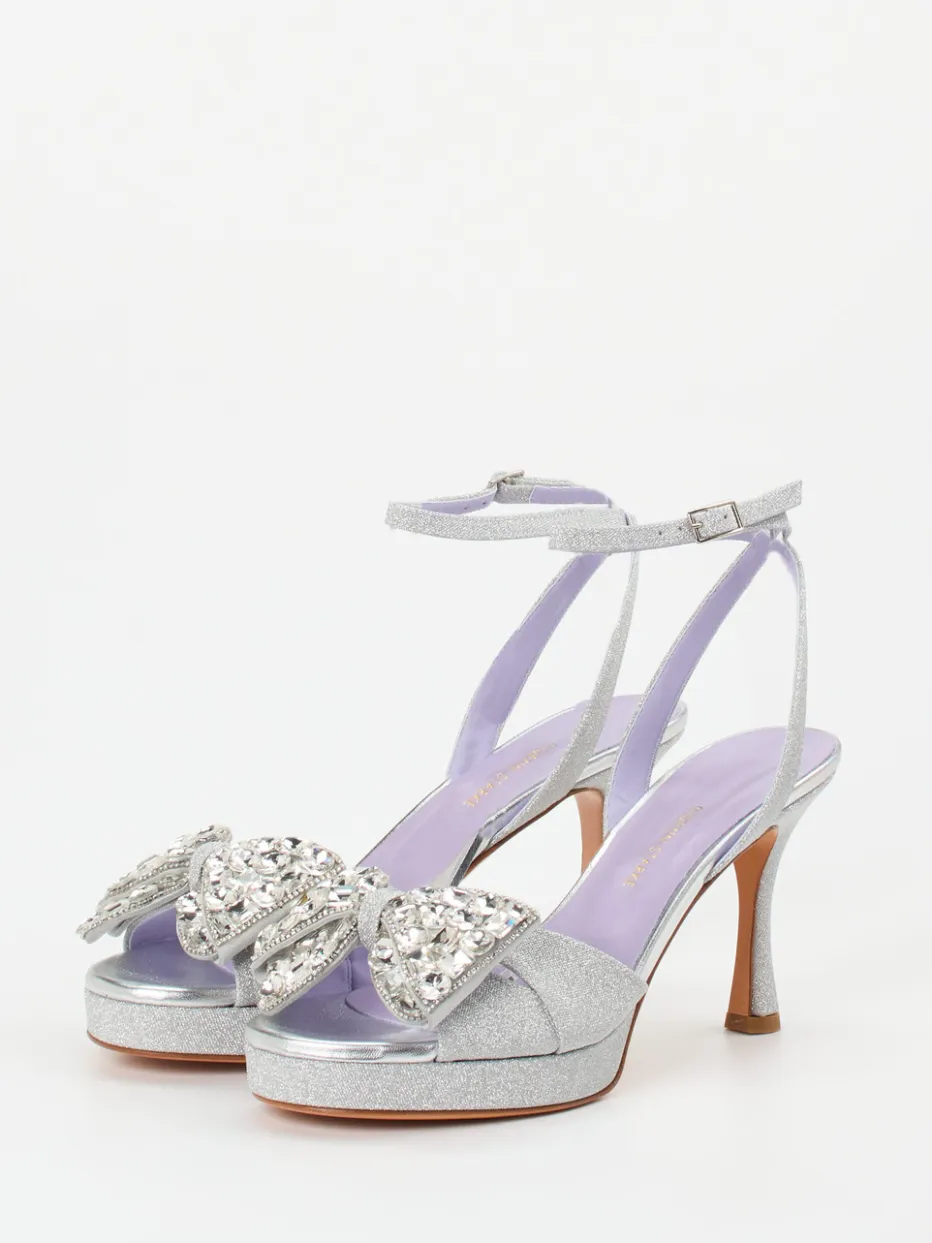 Silbernes Metallicleder trifft auf funkelnde Strassdetails – diese Abendsandale vereint feminine Eleganz mit einem Hauch von Y2K-Glamour.