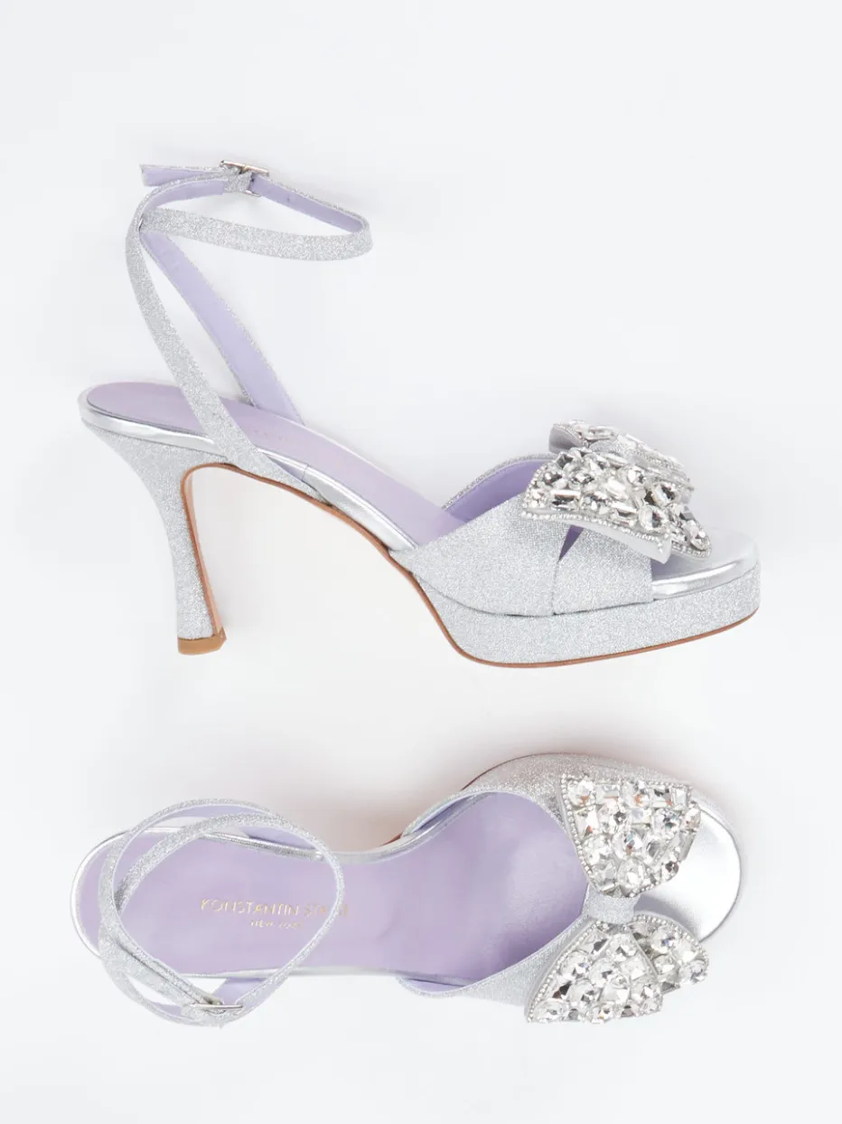 Glanzvoller Auftritt mit Stil.Die silberfarbene Abendsandale von Konstantin Starke überzeugt als modisches Highlight für festliche Outfits. Glänzende Metallicoptik, ein fliederfarbenes Fußbett und die mit Strasssteinen verzierte Schleife am Vorderfuß machen den Schuh zum Blickfang glamouröser Abende. Gefertigt aus hochwertigem Metallicleder und ergänzt durch dezente Riemchen, kreiert das Design eine luftige, feminine Silhouette mit feinem Knöchelriemen und Metallschnalle. Die Ledersohle und das leichte Plateau unterstützen den eleganten Auftritt bei besonderen Anlässen. Aktuelle Trends wie Metallic Accents und Y2K-Revival spiegeln sich gekonnt im Stil wider. Stilvolles Design mit glanzvollem Statement für anspruchsvolle Event-Looks.