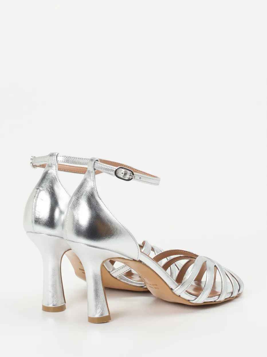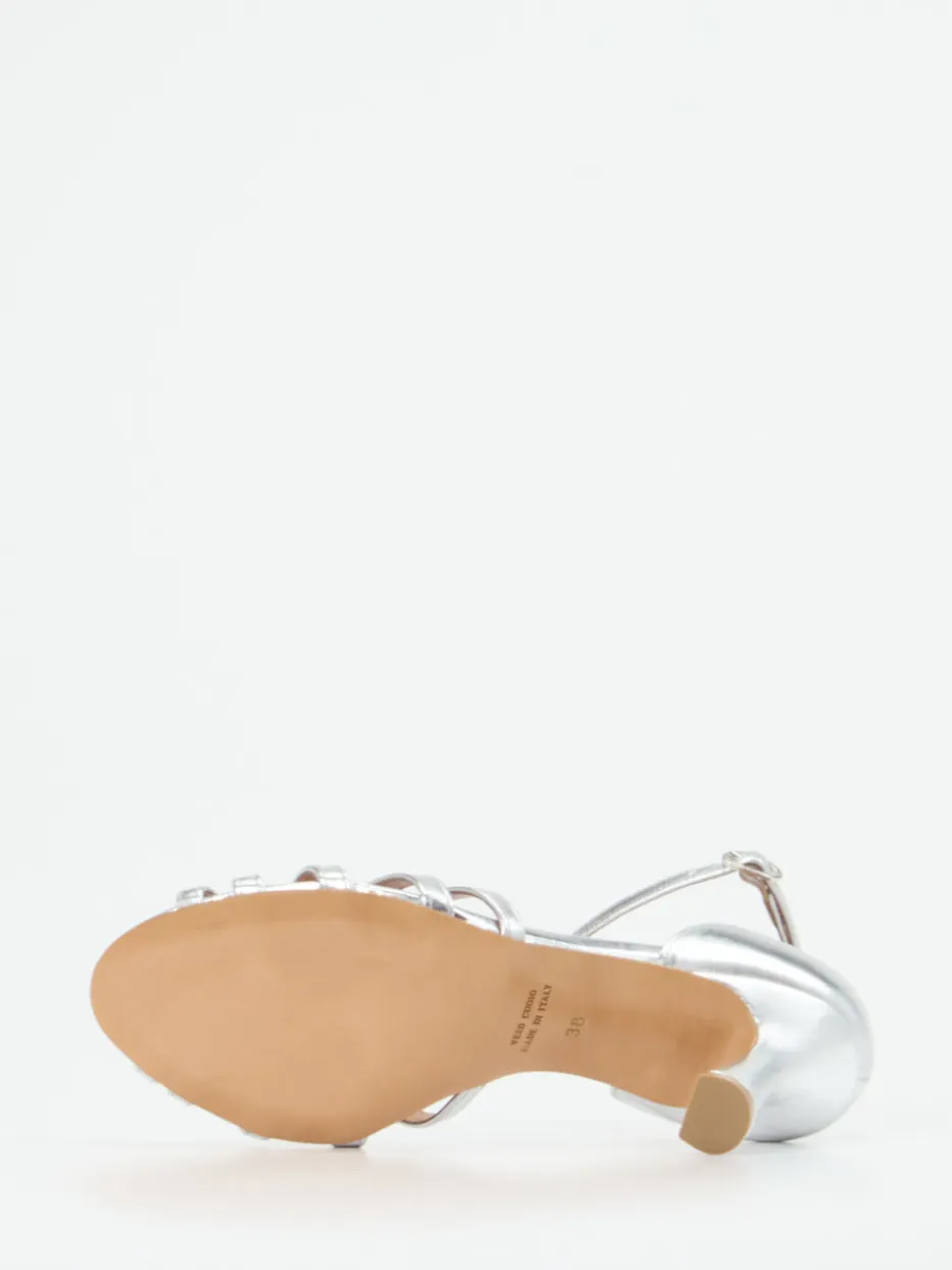 Diese silberfarbene Abendsandale überzeugt durch ihre filigrane Riemenführung und glänzende Oberfläche – ein dezenter Blickfang für stilbewusste Auftritte.