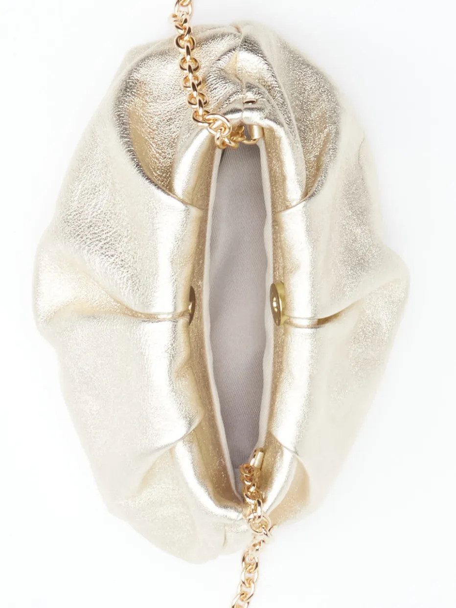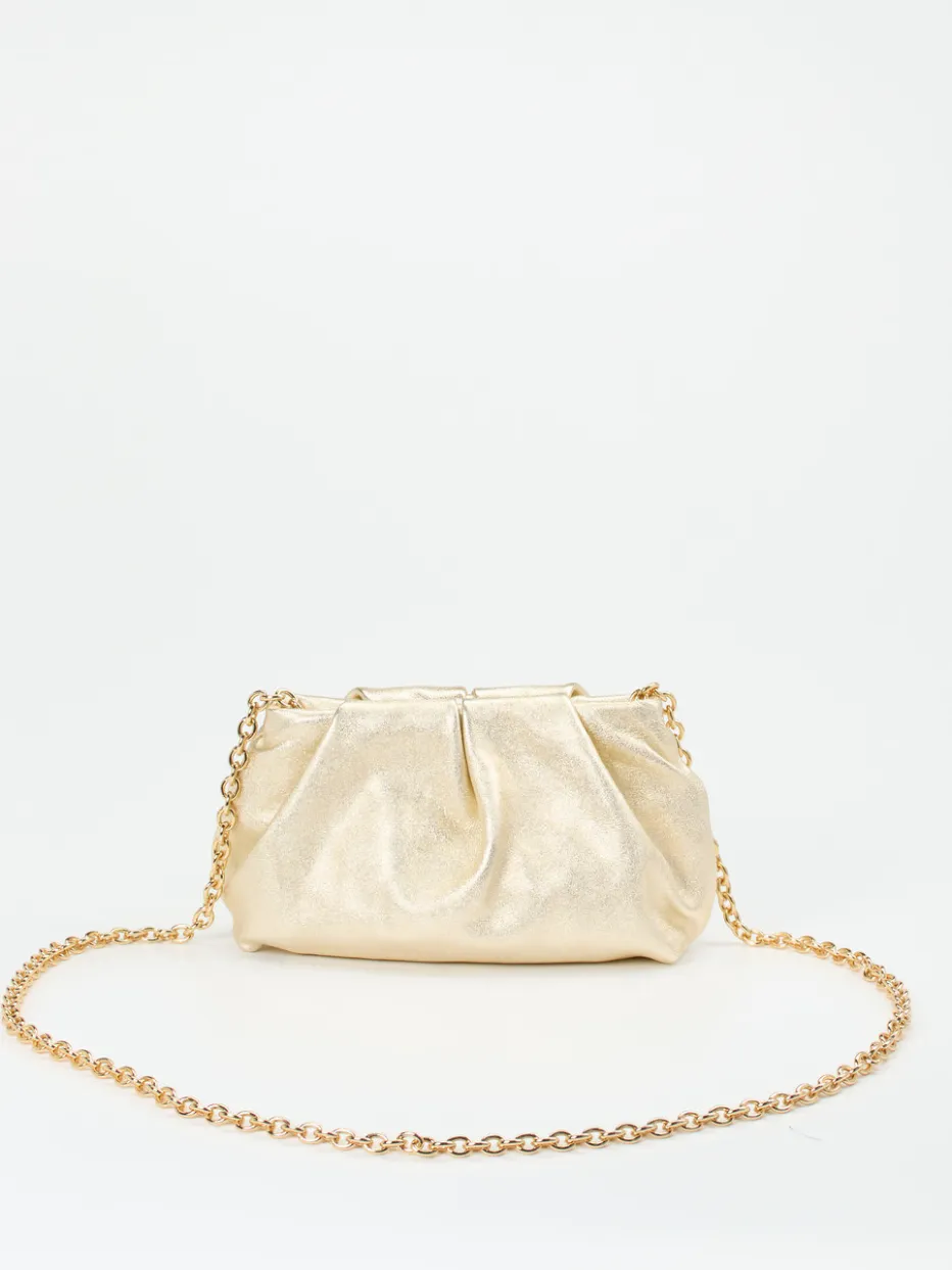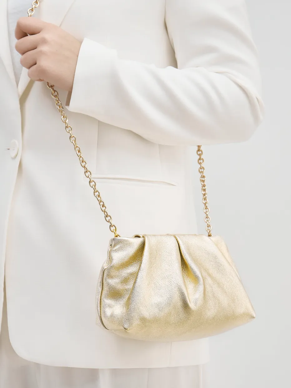 Glänzendes Metallicleder trifft auf filigrane Kettendetails – diese Abendtasche kombiniert festliche Eleganz mit trendbewusstem Design.