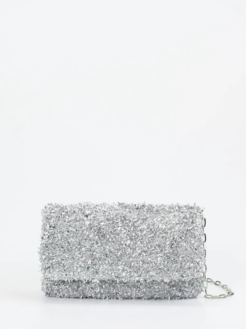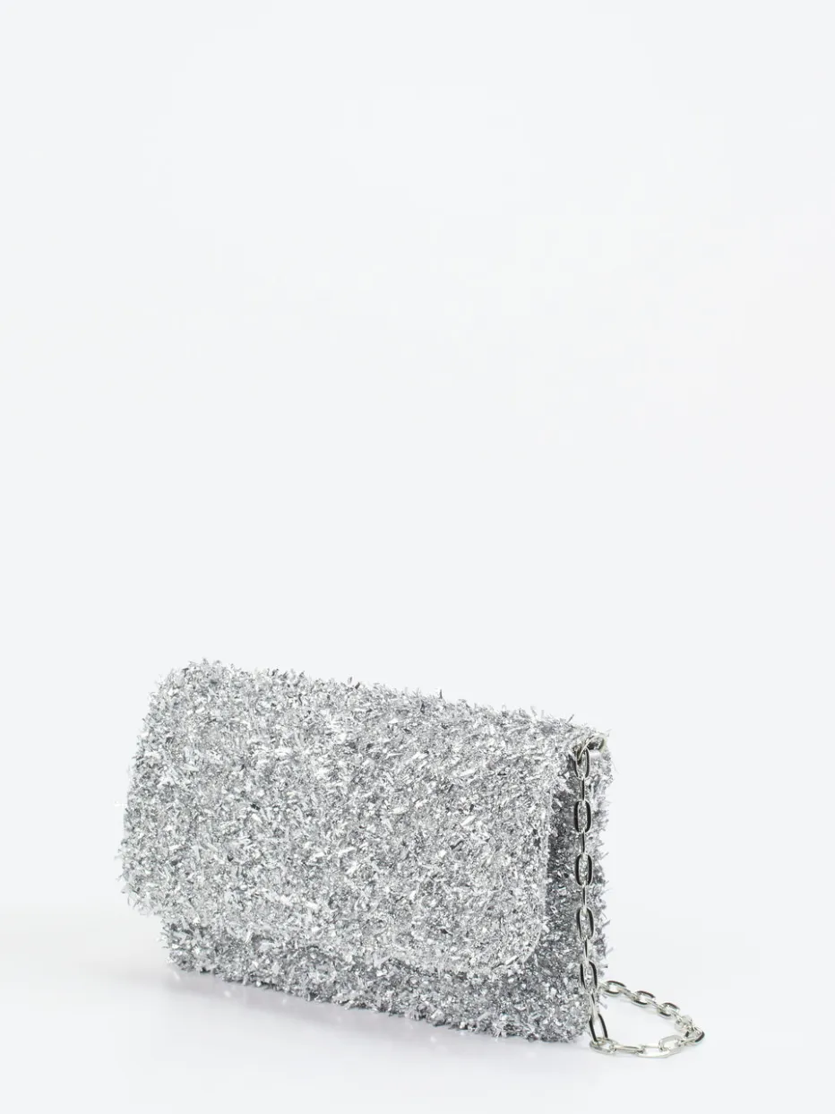 Die silberfarbene Abendtasche verbindet funkelnden Metallic-Look mit moderner Fransen-Oberfläche – ideal für elegante Auftritte mit modischer Attitüde.
