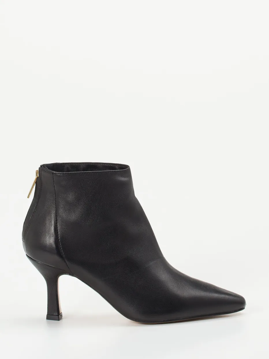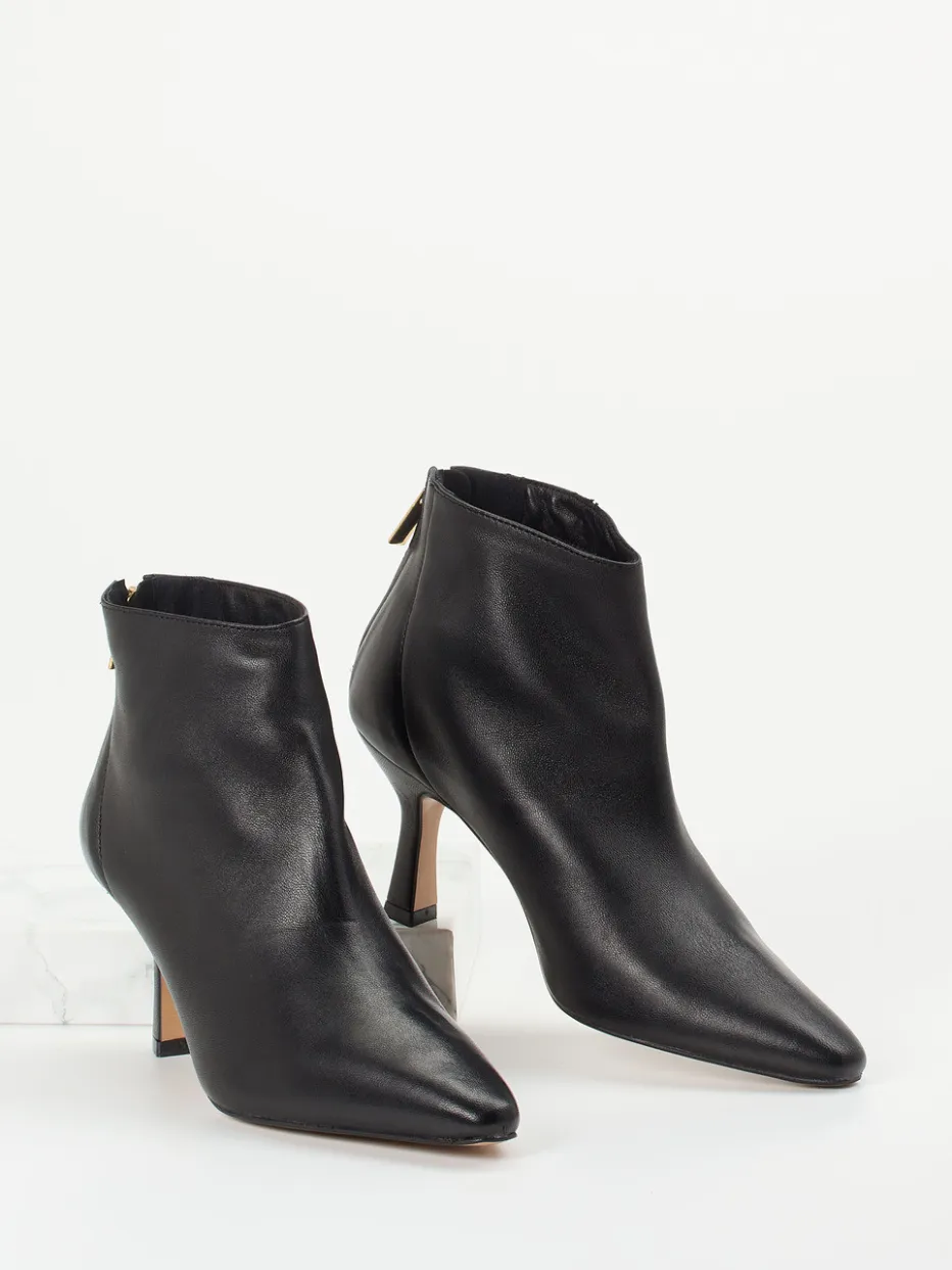 Modernes Understatement mit Highlight-Detail.Die Marke Konstantin Starke interpretiert klassische Damen-Stiefeletten neu. Diese Ankle Boots verbinden schwarzes Lammleder mit mattglänzender Oberfläche und einer taillierten Silhouette mit spitz zulaufender Front. Ein goldfarbener Reißverschluss an der Ferse setzt einen feinen optischen Akzent, ergänzt durch den 7 cm hohen Kitten Heel, der Retro-Charme mit moderner Eleganz kombiniert. Die hochwertige Verarbeitung unterstreicht den Premium-Charakter, während das textile Futter für Tragekomfort sorgt. Optimal für Business- oder Abendlooks im Stil des „Quiet Luxury“. Kombiniert mit einem Wollmantel entsteht ein stilvoller Auftritt. Stilsicheres Design und feminines Finish aus dem Atelier von Konstantin Starke.