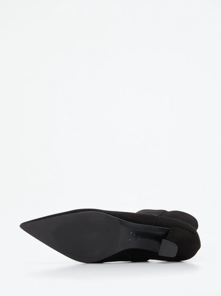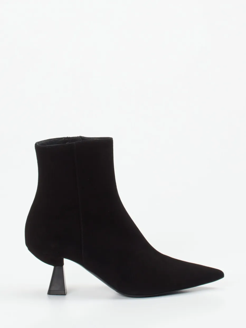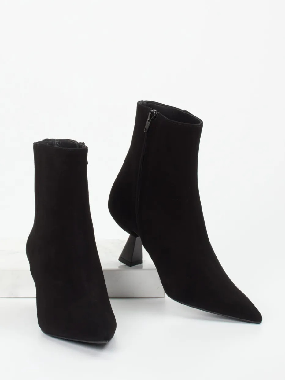 Dank hochwertigem Veloursleder und femininer Linienführung wirken diese Ankle Boots besonders edel. Der skulpturale Absatz verleiht ihnen eine moderne Anmutung mit klassischem Anspruch.