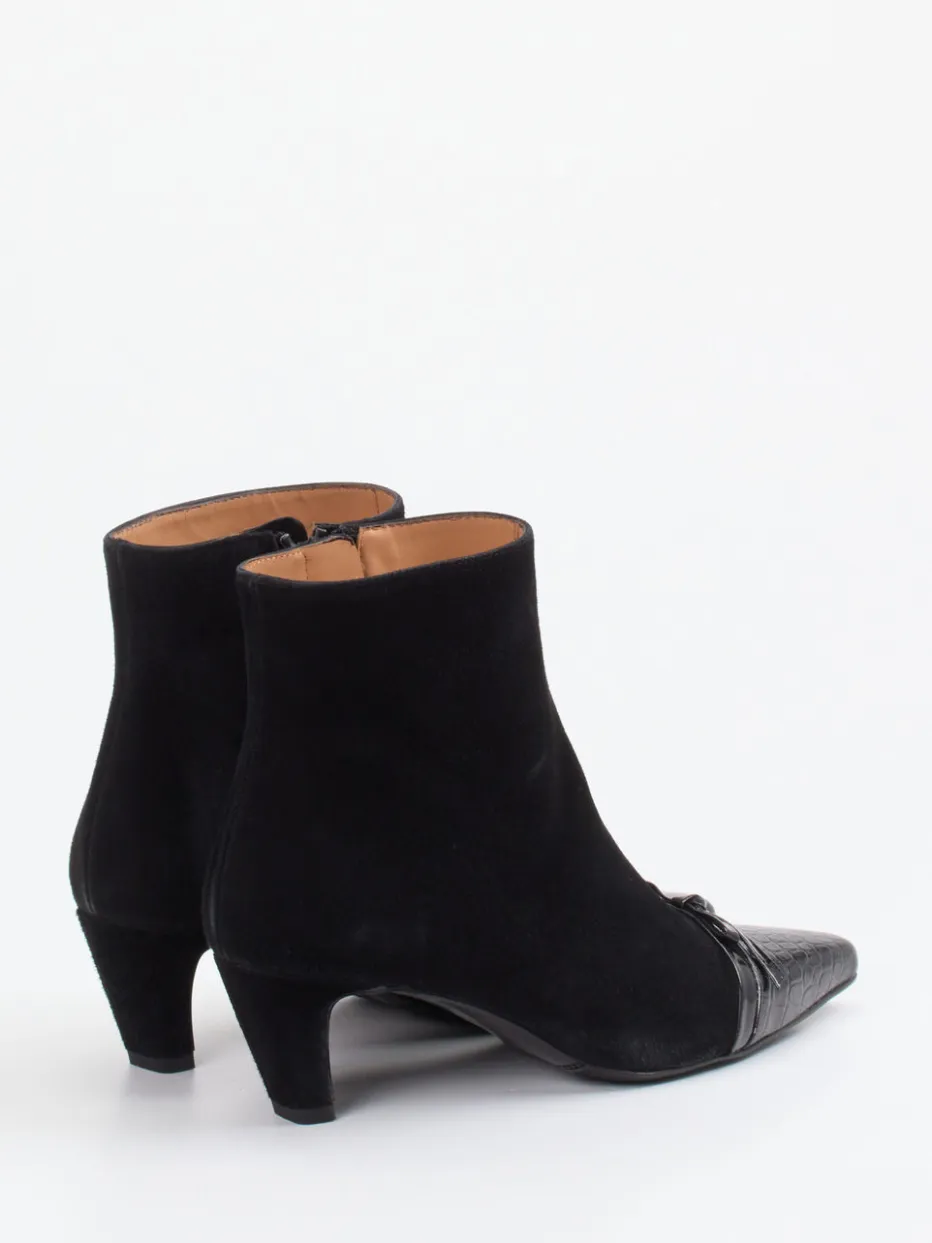 Die Stiefelette vereint edles schwarzes Veloursleder mit einer glänzenden Reptilstruktur-Kappe. Der raffinierte Materialkontrast bringt klassische Eleganz mit modernem Twist.