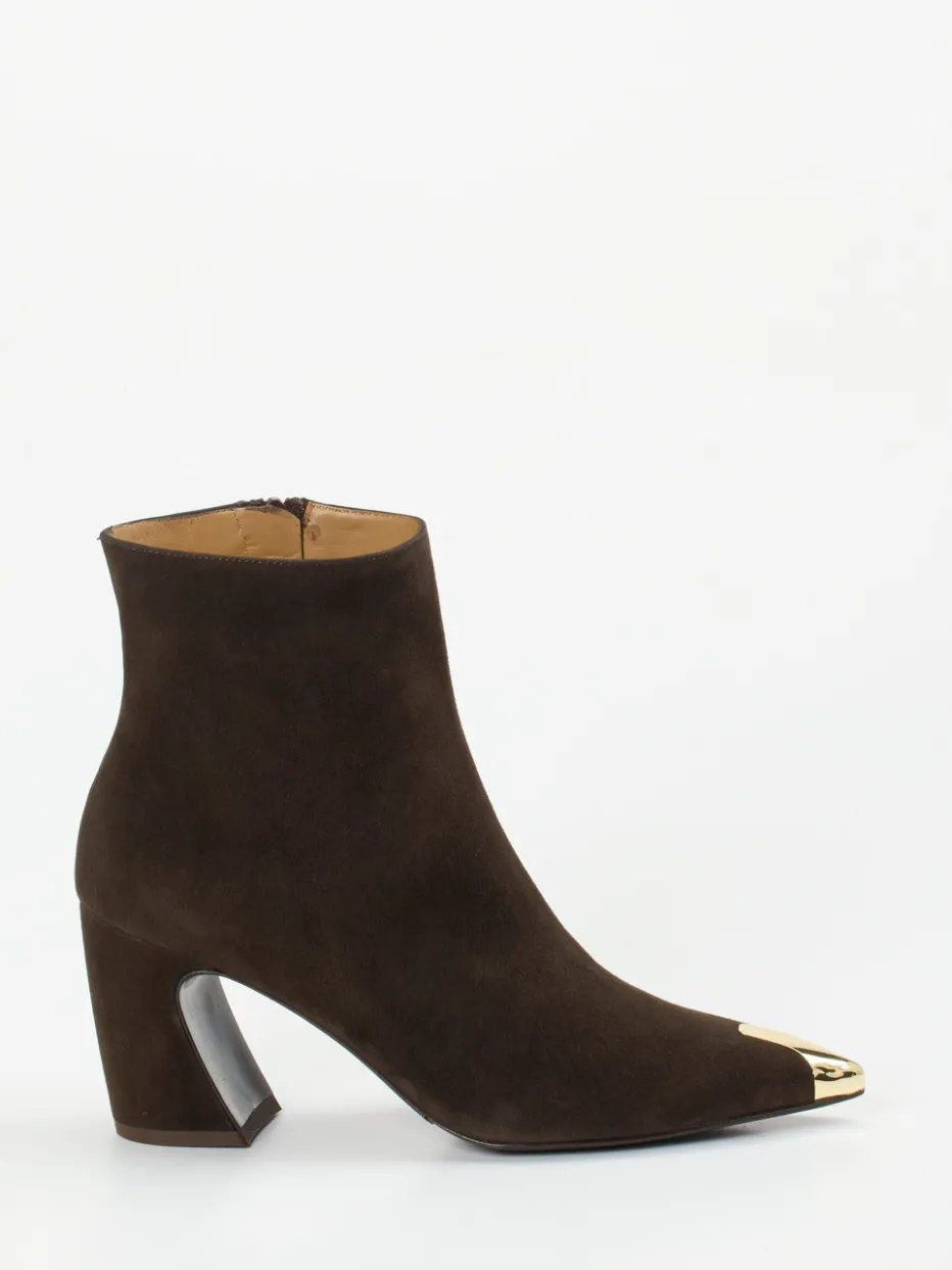 Puristische Eleganz mit Statement-Faktor.Konstantin Starke präsentiert stilvolle Damen-Ankle Boots, die hochwertiges Veloursleder in Dunkelbraun mit auffälligen Akzenten verbinden. Ideal für urbane Tageslooks und den eleganten Auftritt am Abend: Das samtig angeschliffene Veloursleder trifft auf eine verspiegelte, goldene Metallspitze – ein Blickfang im Sinne der aktuellen Metallic-Trends. Die taillierte Silhouette mit geschwungenem 6 cm Blockabsatz betont das feminine Design, während der seitliche Reißverschluss eine komfortable Handhabung erlaubt. Dezente Western-Anklänge und ein Innenfutter aus Kalbleder runden das minimalistische Gesamtbild ab. Gut kombinierbar mit goldfarbener Clutch und Wollmantel. Ein Eyecatcher mit klassischer Note – für modisch geschärfte Styles.