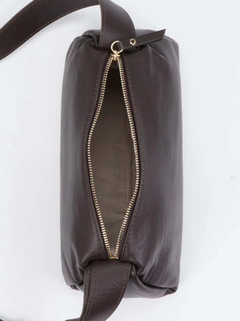 Diese dunkelbraune Schultertasche vereint minimalistisches Design mit edlem Lammleder – ein stilvoller Begleiter für Büro und Alltag.