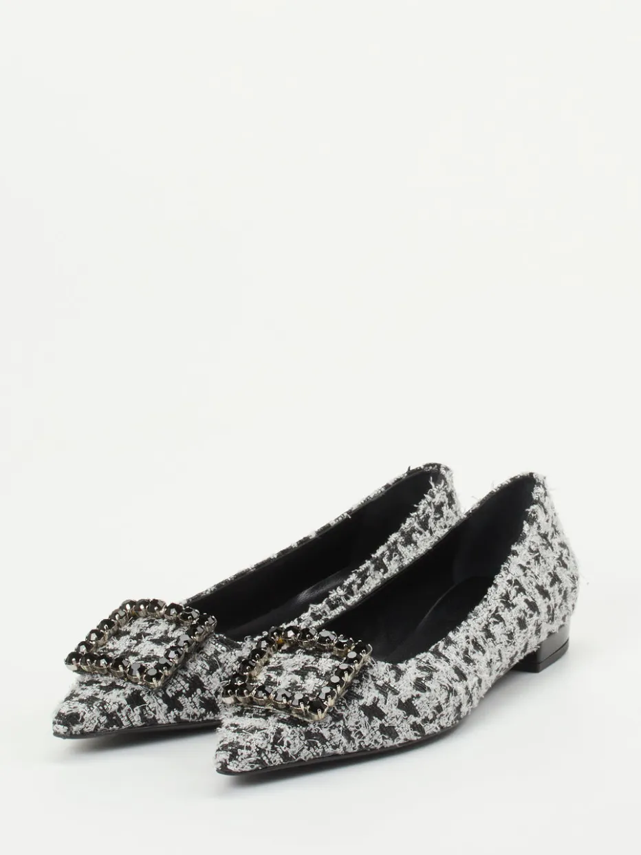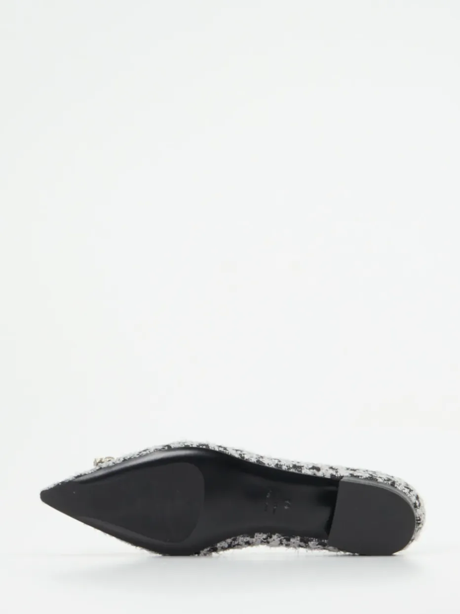 Diese spitz zulaufenden Bouclé-Ballerinas verbinden klassisches Hahnentrittdesign mit einer edlen Schmuckschließe – ein dezentes Highlight im Business- oder Anlassoutfit.