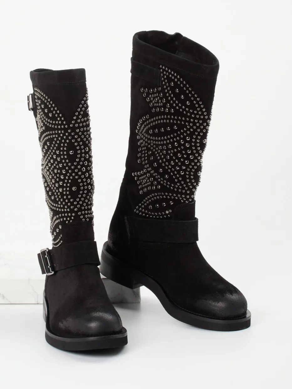 Konstantin Starke präsentiert Damen-Biker Boots aus schwarzem Veloursleder.