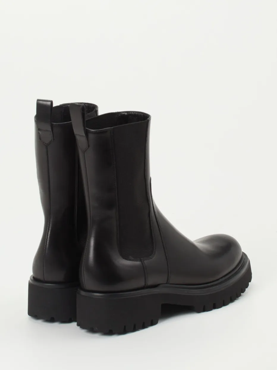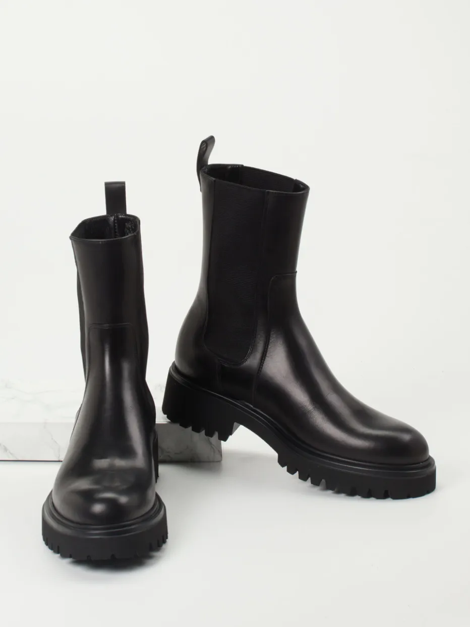 Schwarzes Kalbleder in glänzender Optik trifft auf markante Chunky-Sohle – ein Statement für stilbewusste Minimalistinnen.