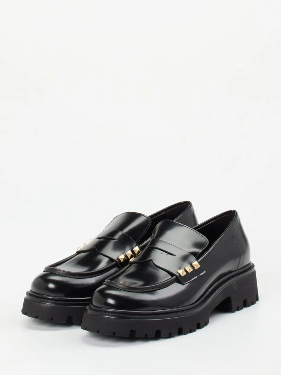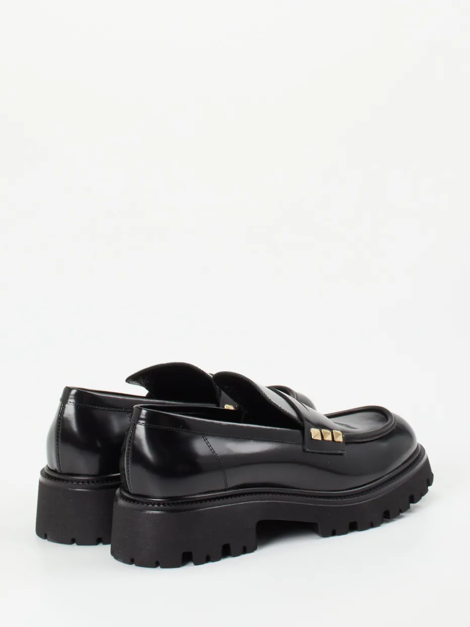 Dieser schwarze Loafer vereint minimalistisches Design mit glänzender Raffinesse und wird durch goldfarbene Pyramidennieten zum stilvollen Streetwear-Highlight.