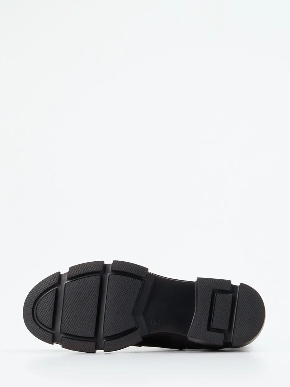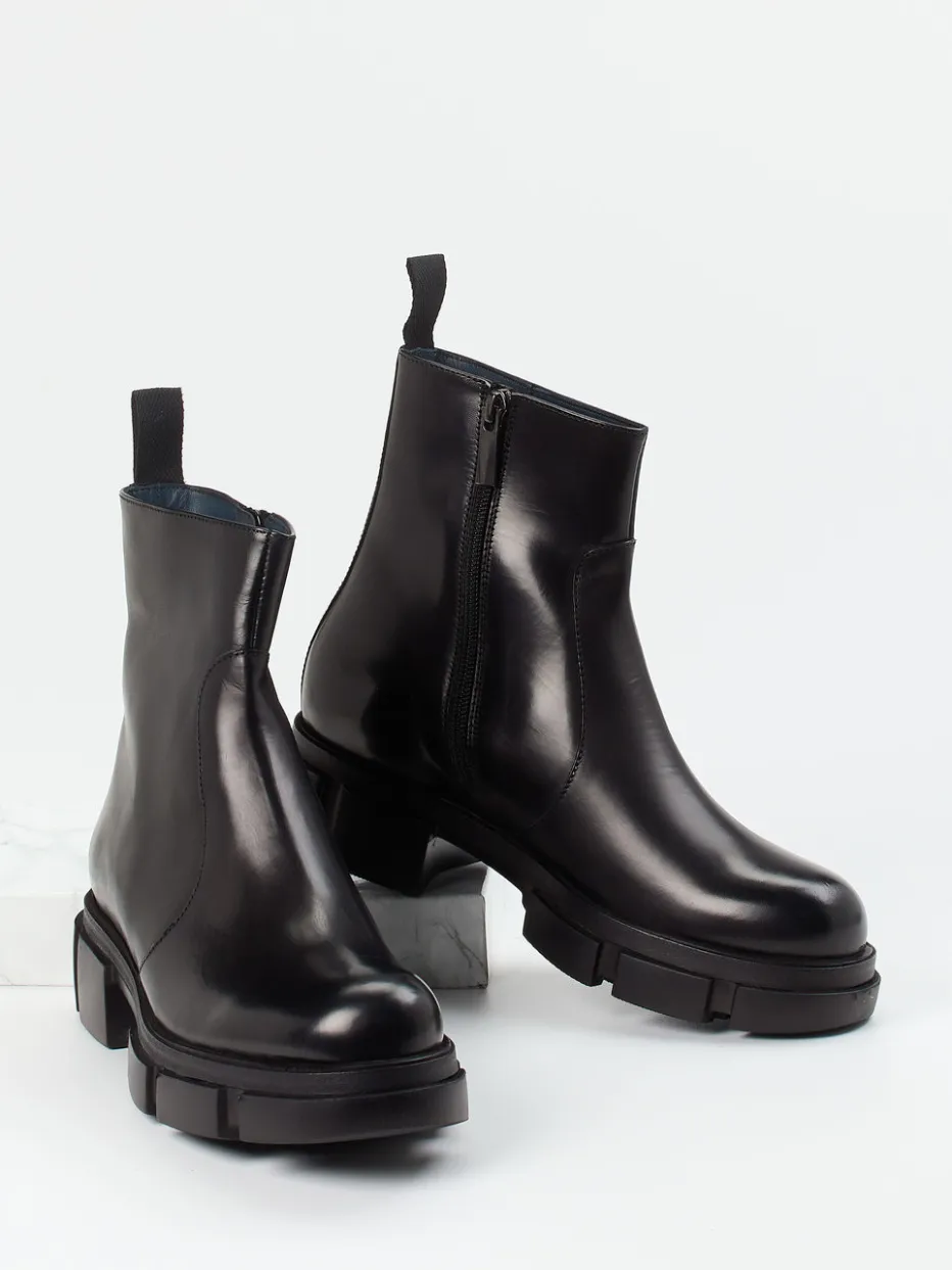 Diese Chunky-Stiefelette verbindet glänzend schwarzes Kalbleder mit klarer Formsprache und markanter Profilsohle – ein stilbewusstes Statement im Zeichen urbaner Eleganz.