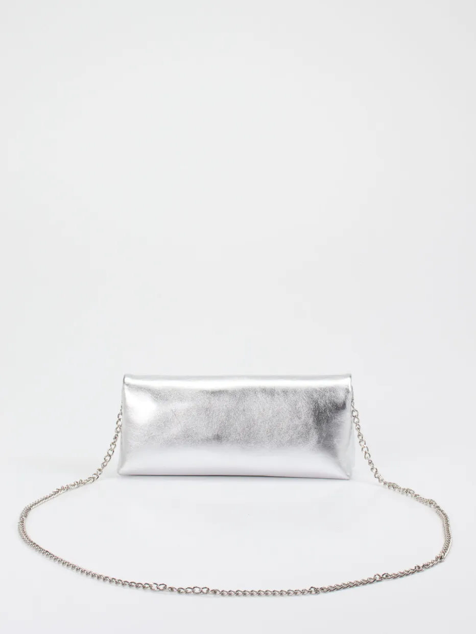 Die silberfarbene Clutch besticht durch minimalistisches Design, edle Glanzoptik und wandelbare Tragemöglichkeiten. Ein stilvolles Accessoire für moderne Abendlooks.