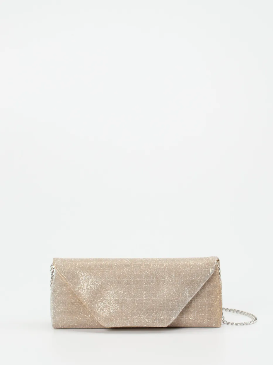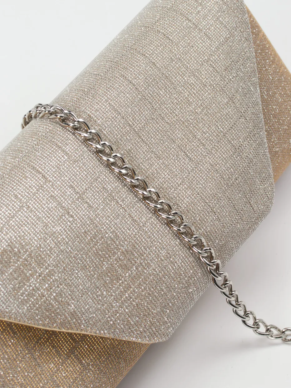Der edle Glitzereffekt auf champagnerfarbenem Textil und eine elegante Silberkette verleihen dieser Abendtasche einen raffinierten, festlichen Charakter mit dezenter Vintage-Note.