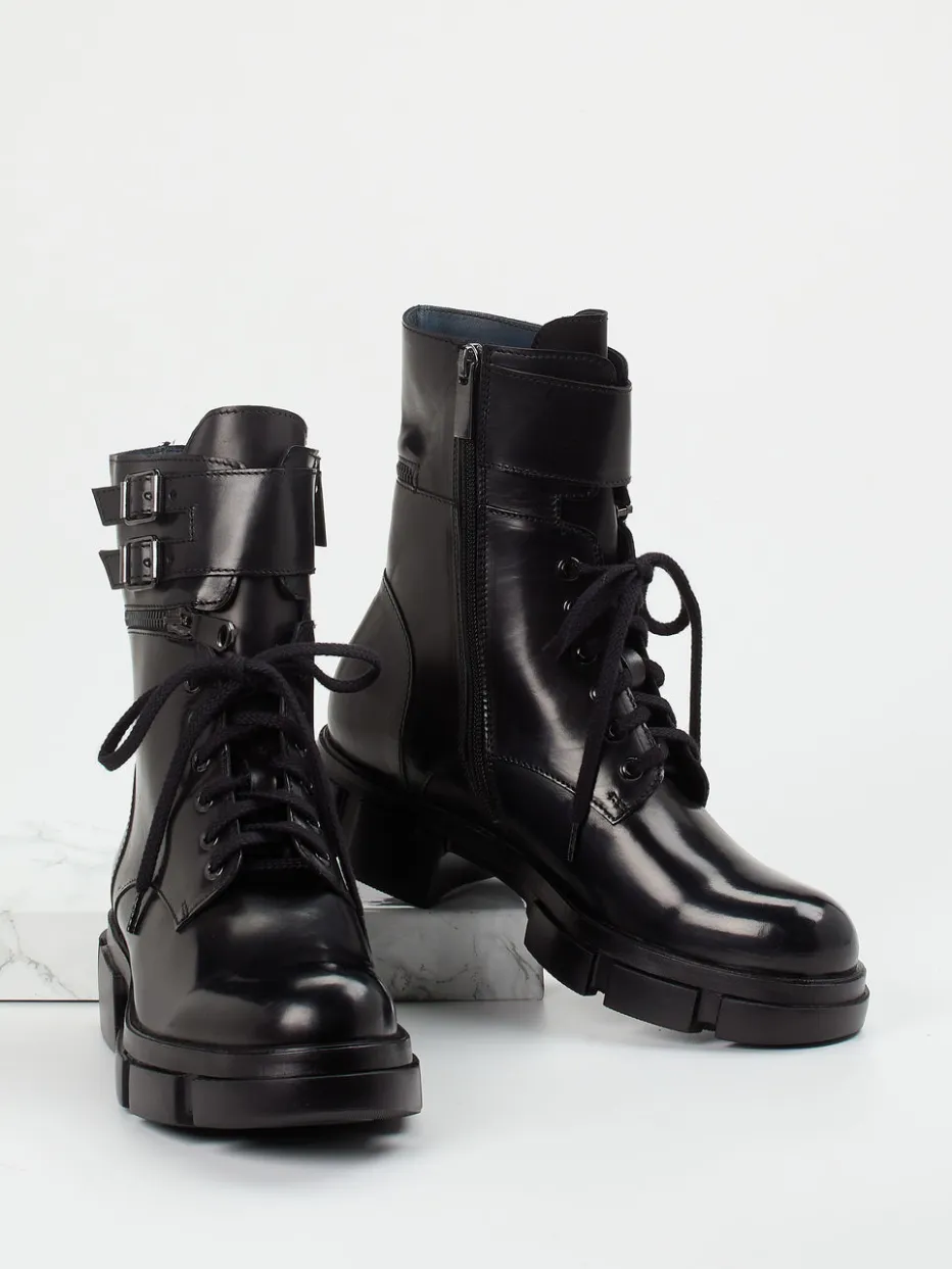Diese glänzenden Schnürstiefeletten vereinen hochwertiges Kalbleder mit urban inspiriertem Design – ideal für klare Looks mit modischer Aussage.