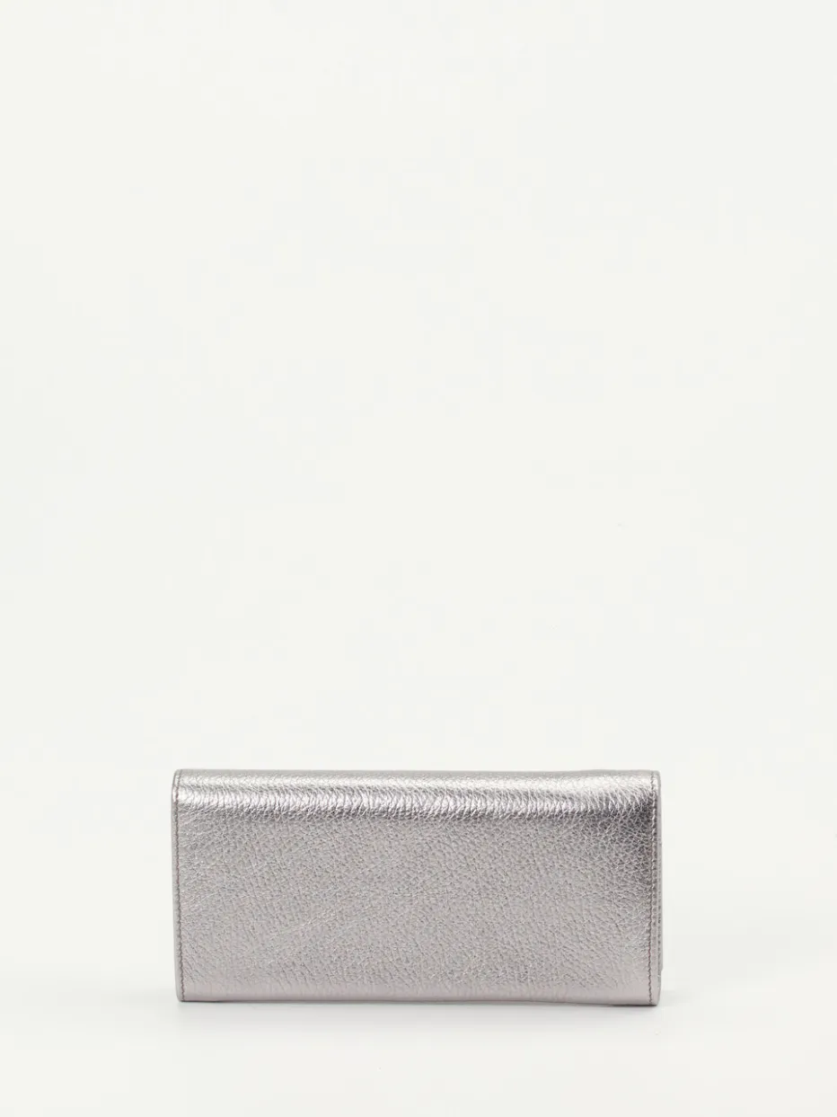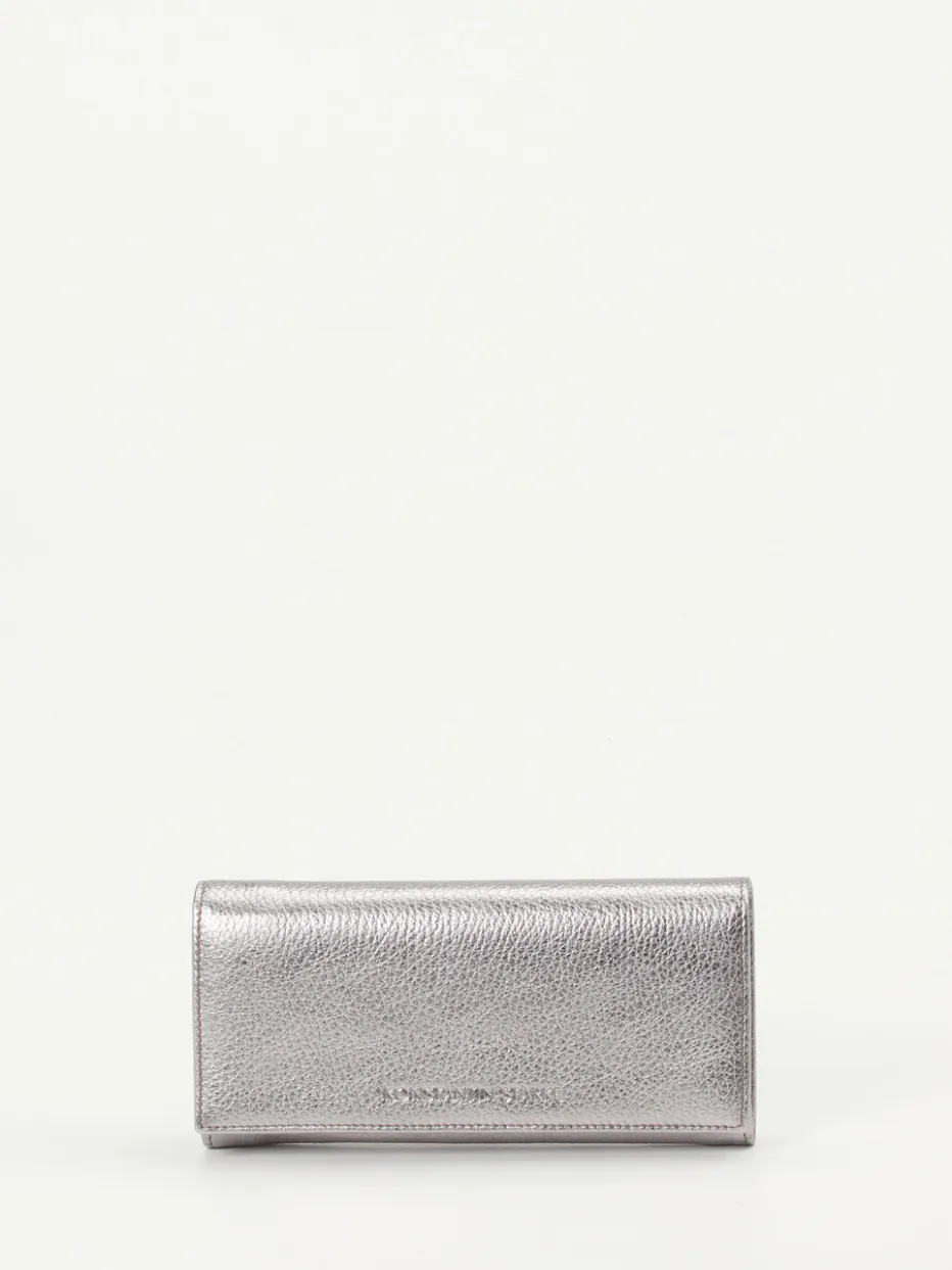 Die elegante Langbörse aus metallic-schimmerndem Kalbleder überzeugt durch ihr minimalistisches Design und eine durchdachte Innenaufteilung mit Reißverschlussfach.