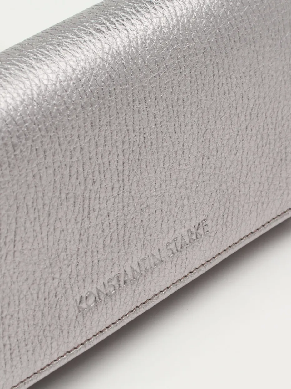 Aus hochwertigem, genarbtem Kalbleder gefertigt überzeugt dieses geräumige Portemonnaie aus dem Hause Konstantin Starke. Das metallisch glänzende, silberfarbene Leder wird zum Blickfang! Karten, Bargeld und Belege können dank der überlegten Aufteilung sicher und praktisch verstaut werden. – Material: Kalbleder – Farbe: silberfarben – Größe: ca. 10 x 19 x 2,5 cm (H x B x T) – Innen: acht Kartenfächer, zwei Geldscheinfächer, ein Steckfach, ein Fach mit Reißverschluss – Verschlussart: zwei Druckknöpfe