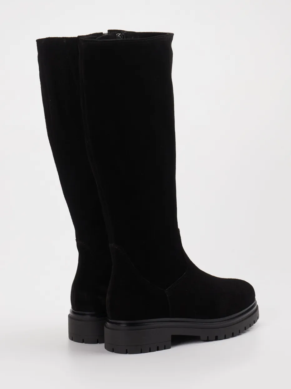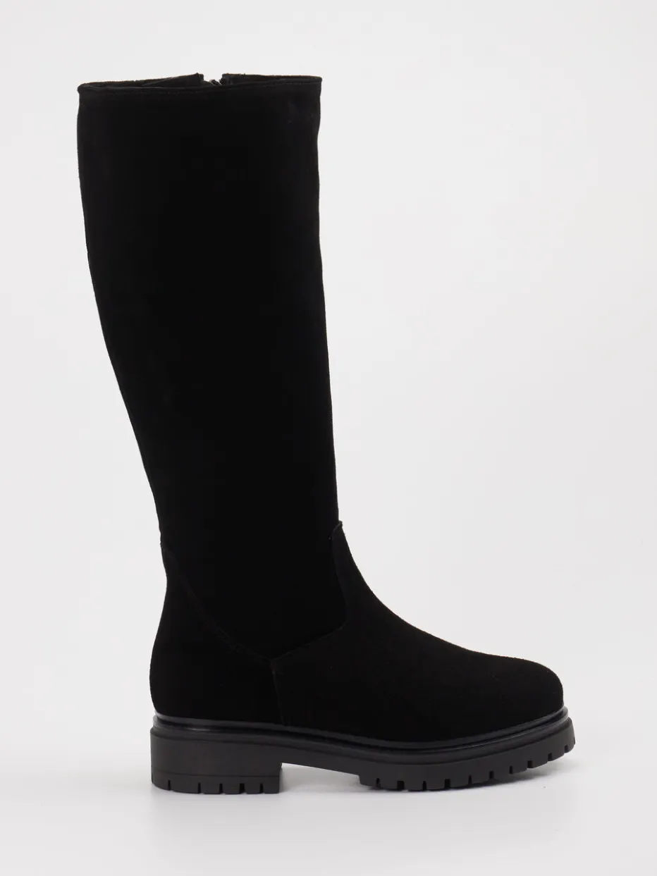 Die klar strukturierte Silhouette und die matte Veloursleder-Optik machen diesen Stiefel zum kombinationsstarken Begleiter für moderne Herbst-/Winter-Looks.