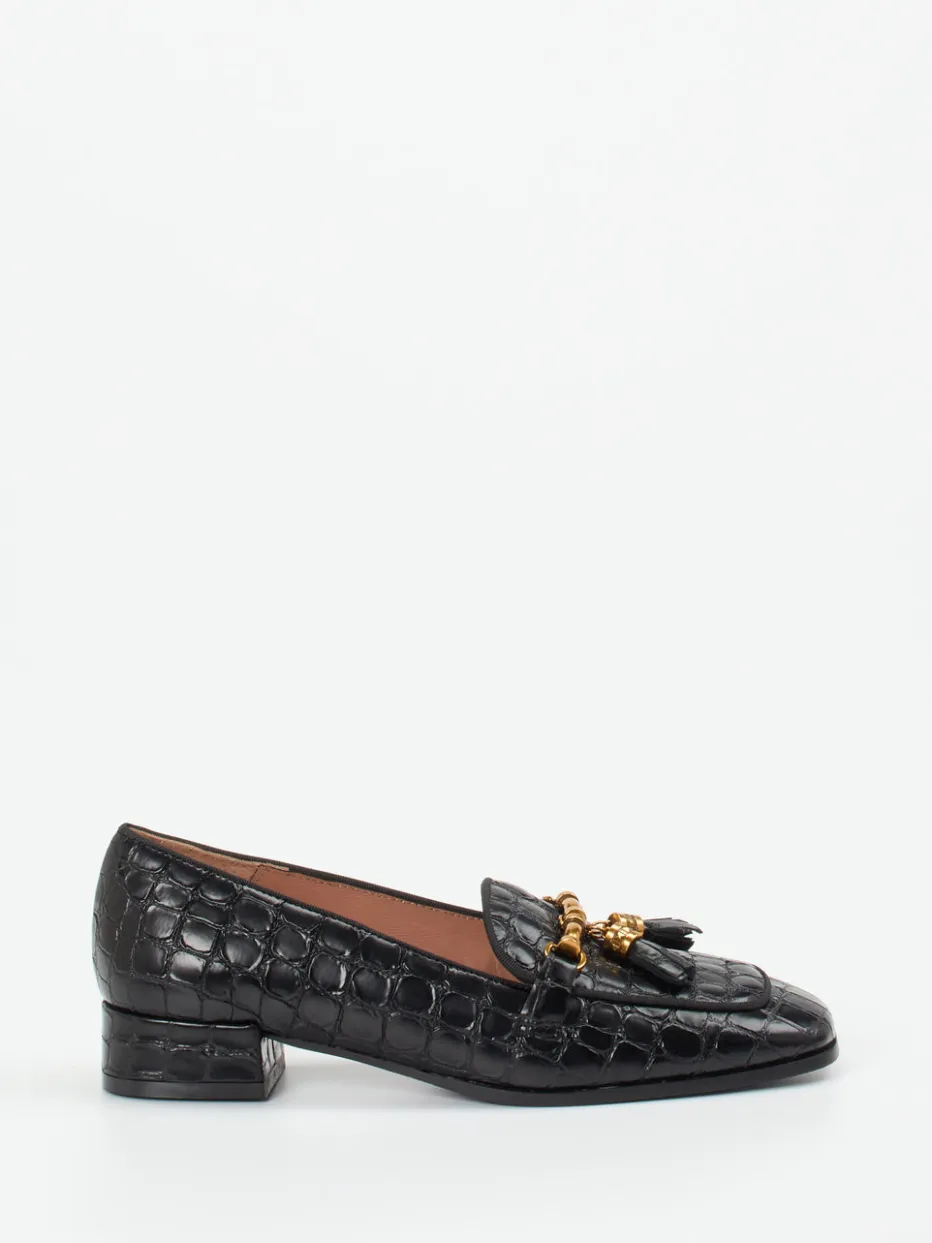 Dieser Damen-Loafer kombiniert glänzendes Krokodruckleder mit goldfarbener Garnitur – klassisch inspiriert und dennoch im Trend der ruhigen Luxusästhetik.