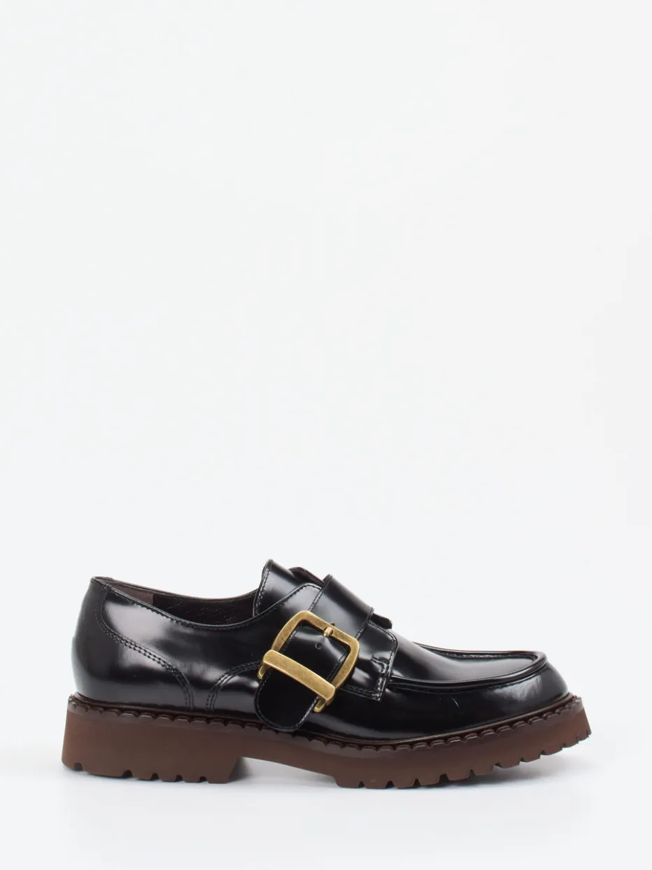 Dieser Loafer verbindet luxuriöses Hochglanzleder mit einer robusten Plateausohle und sorgt so für markante Akzente im stilvollen Alltag. Die auffällige Messingschnalle unterstreicht den modischen Statement-Charakter.
