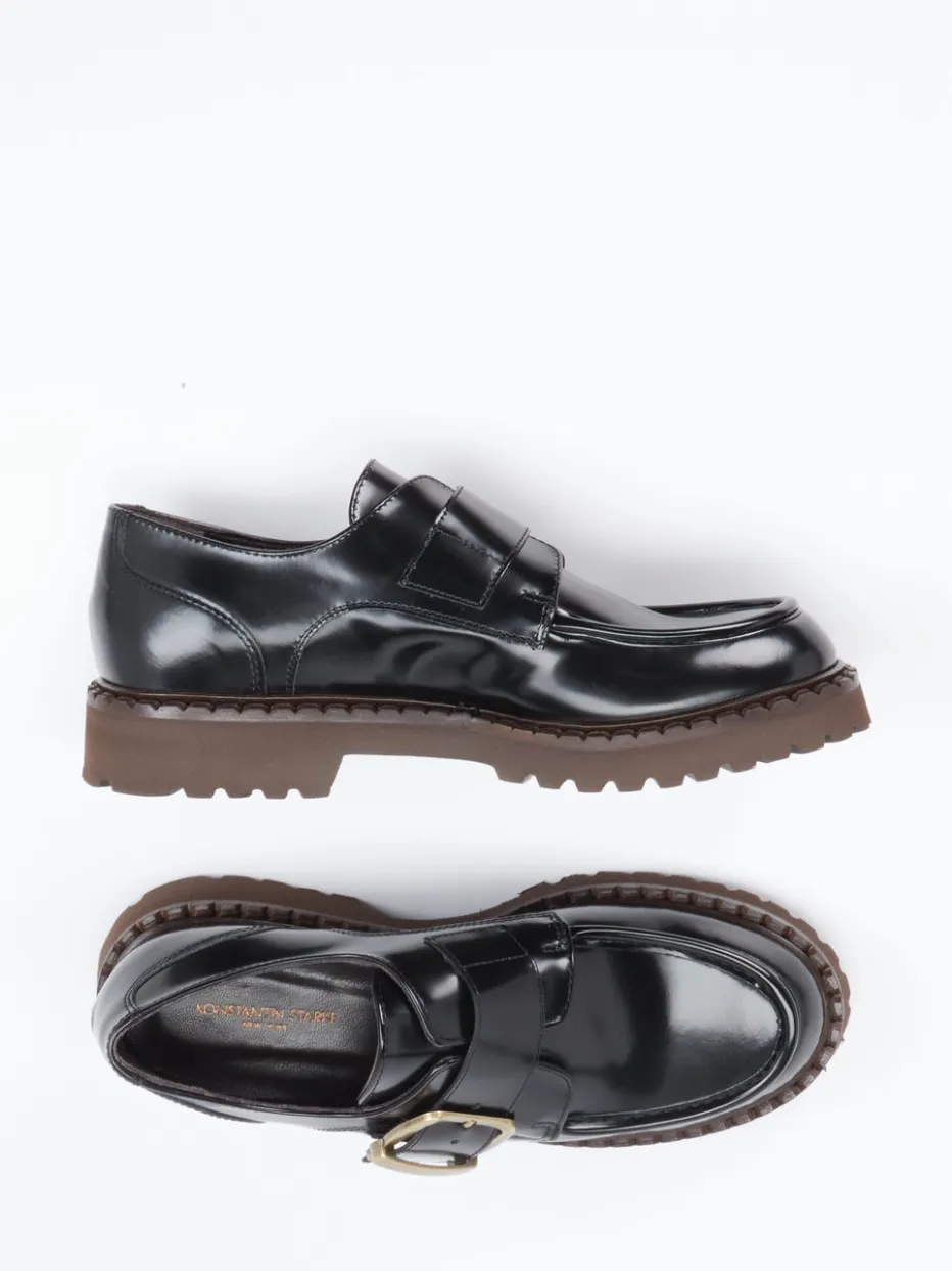Statement-Design trifft klassisches Finish.Konstantin Starke bringt mit diesem Damen-Loafer ein stilistisches Highlight in die Kategorie Halbschuhe. Ideal für Office-Tage oder elegante Urban-Looks: Gefertigt aus schwarzem Hochglanzleder mit glatter, edler Oberfläche, überzeugt dieser Loafer durch seine klassische Silhouette und die große, messingfarbene Schnalle als Eyecatcher. Die profilierte, kaffeebraune Gummisohle mit 3,5 cm Absatz sorgt für angenehmen Halt und verleiht gleichzeitig eine modische Chunky-Note. Heritage-Anleihen und Streetwear-Trends fließen harmonisch in das Design ein. Kombiniert mit weit geschnittenen Stoffhosen entsteht ein souveräner Look. Ein Design, das Tradition modern interpretiert – in hochwertiger Verarbeitung und stilgerechter Präsenz.