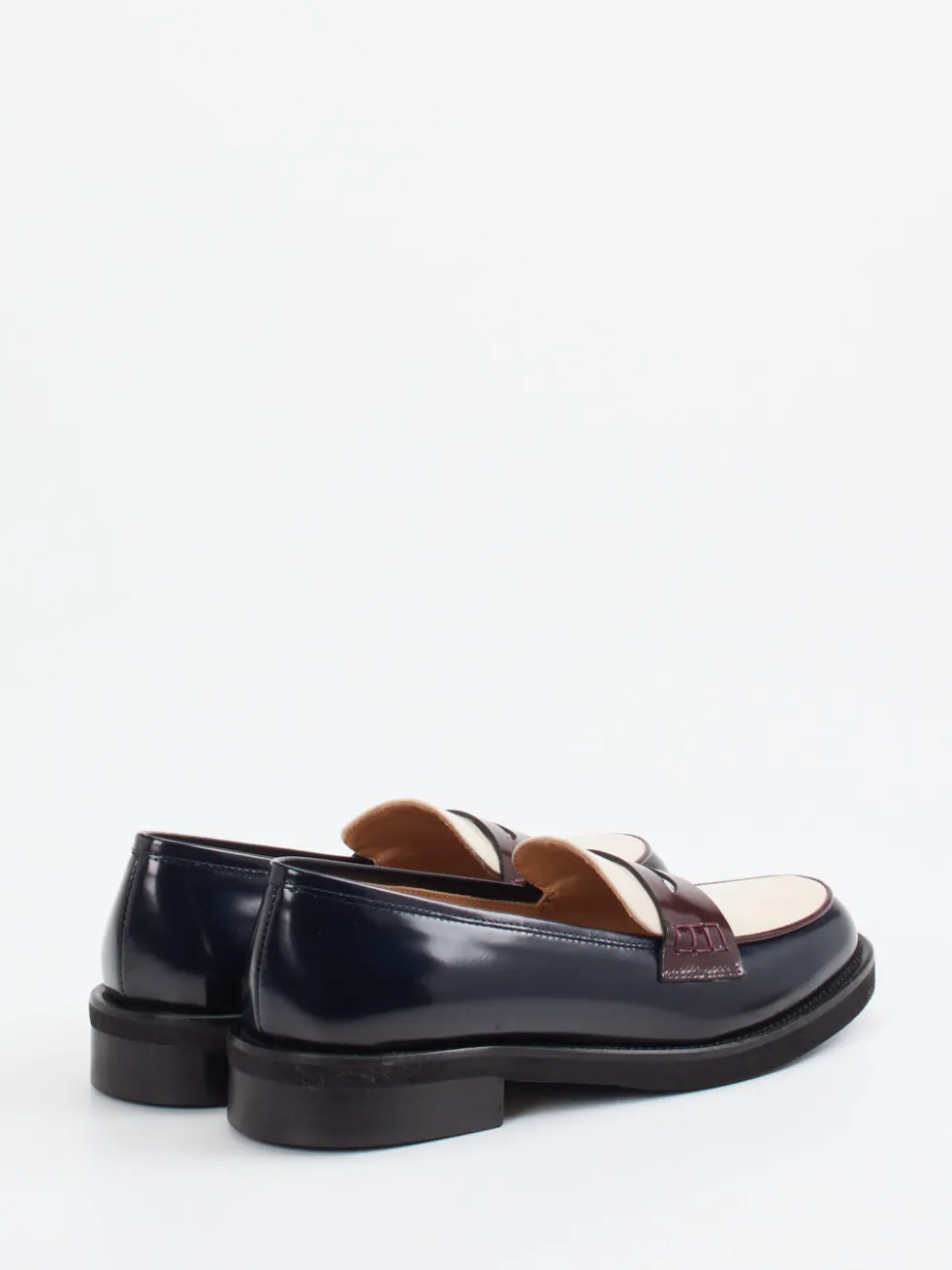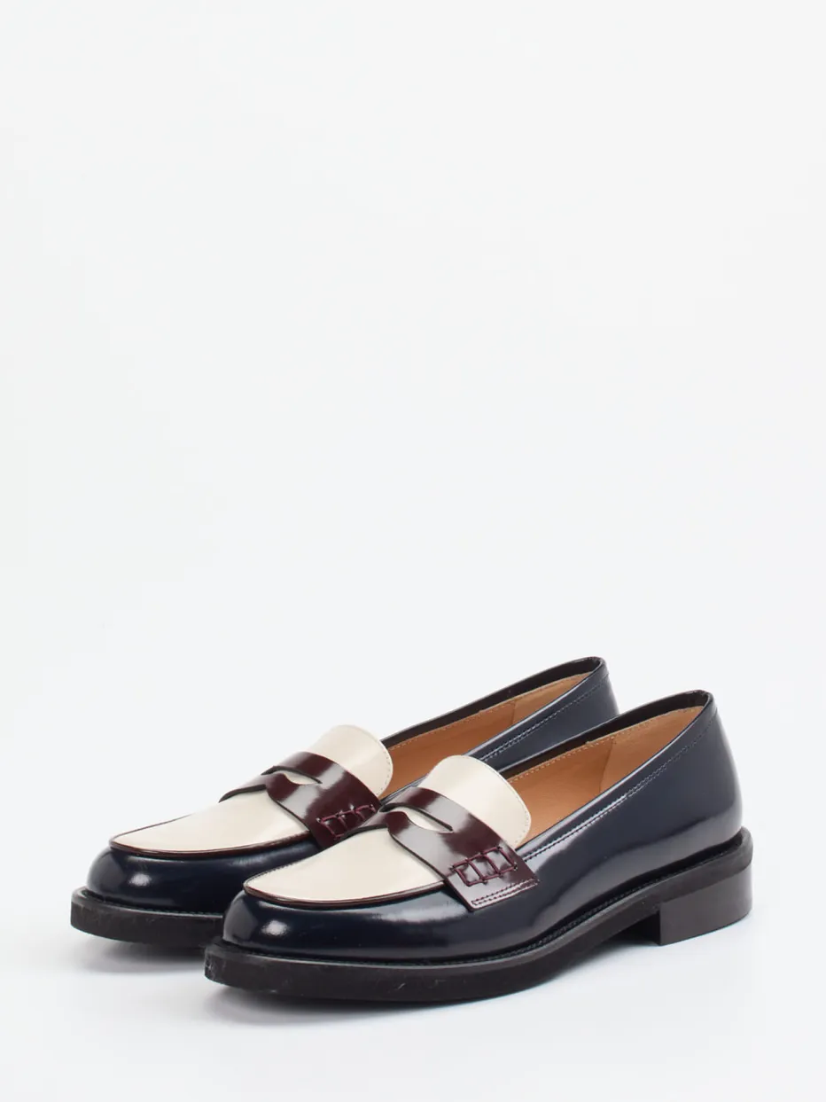 Ideal für elegante Alltagslooks im Büro oder in der Freizeit: Der schlicht gehaltene Slipper ist aus glänzendem Hochglanzleder gefertigt und kommt in stilvollem Tiefblau. Besondere Akzente setzen das cremefarbene Kontrastblatt und ein edler Riemen in Bordeaux-Kroko-Optik. Die klassische, flache Silhouette mit gepolstertem Fußbett sorgt für komfortablen Halt, während die profilierte Gummisohle Alltagstauglichkeit garantiert. Modisch zwischen Heritage und Quiet Luxury positioniert, ergänzt er ebenso Hosenanzüge wie fließende Stoffhosen.
