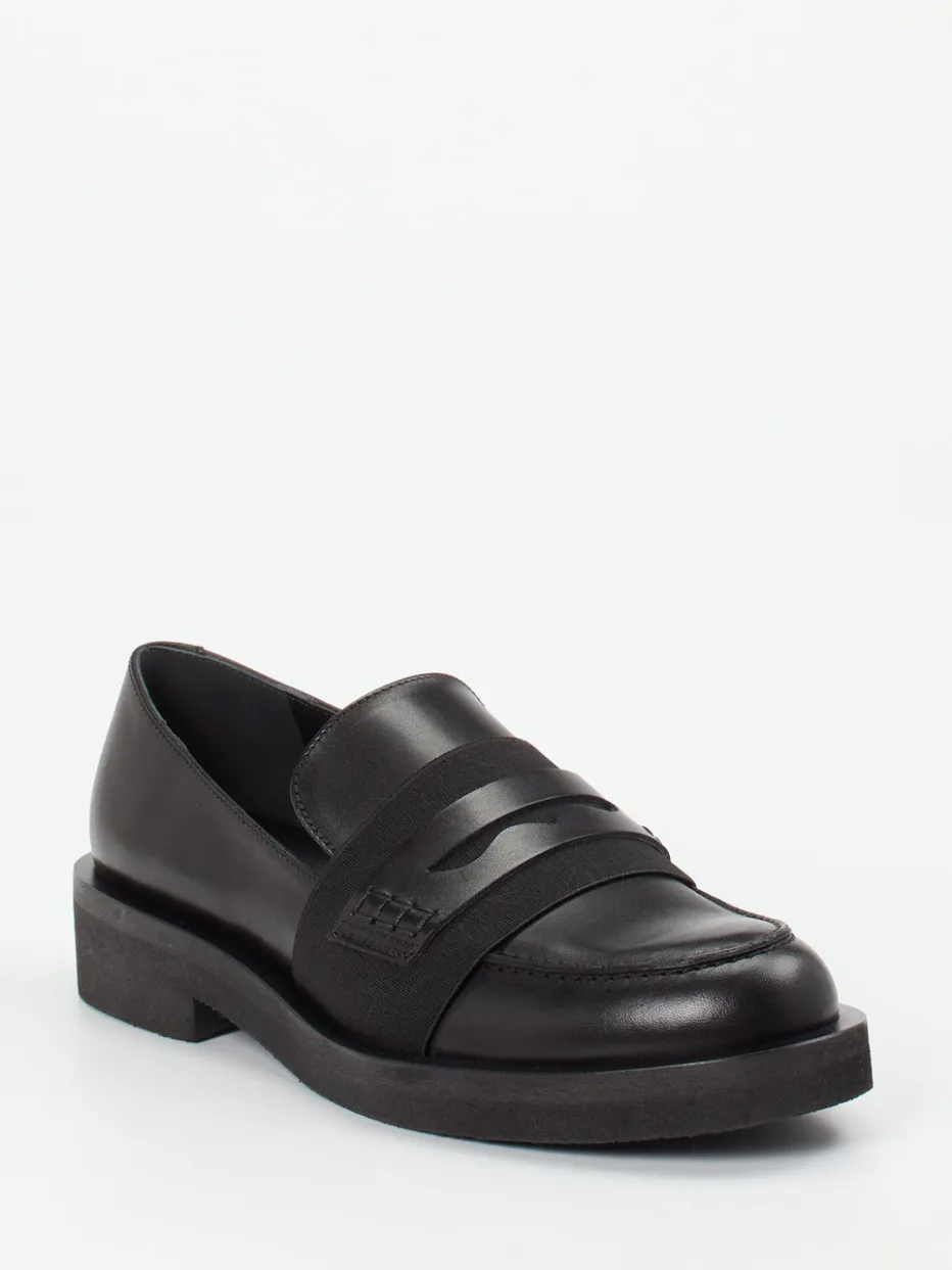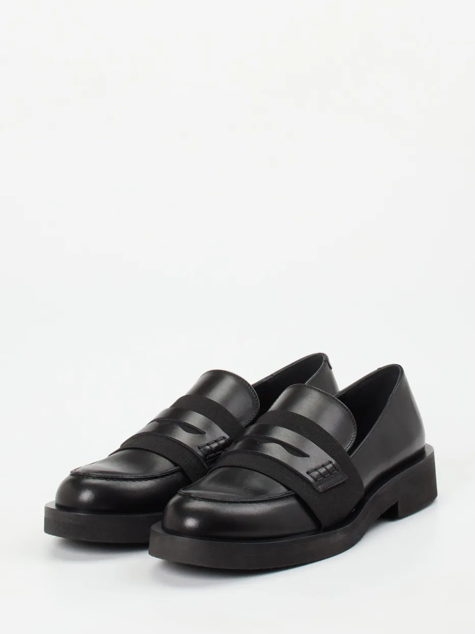 Gefertigt aus schwarzem Kalbleder mit matter Oberfläche, überzeugt der Loafer durch ein breites Elastikband mit aufgesetzter Ristspange. Die robuste Leichtzellsohle mit leichtem Profil sorgt für Trittsicherheit und Alltagstauglichkeit. Innen verspricht weiches Lederfutter angenehmen Tragekomfort. Das schnörkellose Design in Ton-in-Ton-Nähung spricht eine minimalistische Formensprache und greift den „Quiet Luxury“-Trend auf. Kombinierbar zu Klassikern wie Blazer und Satchel Bag.