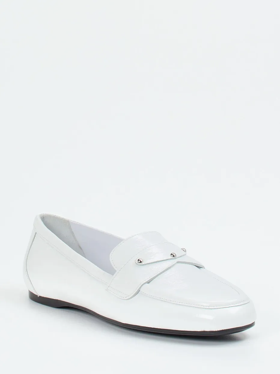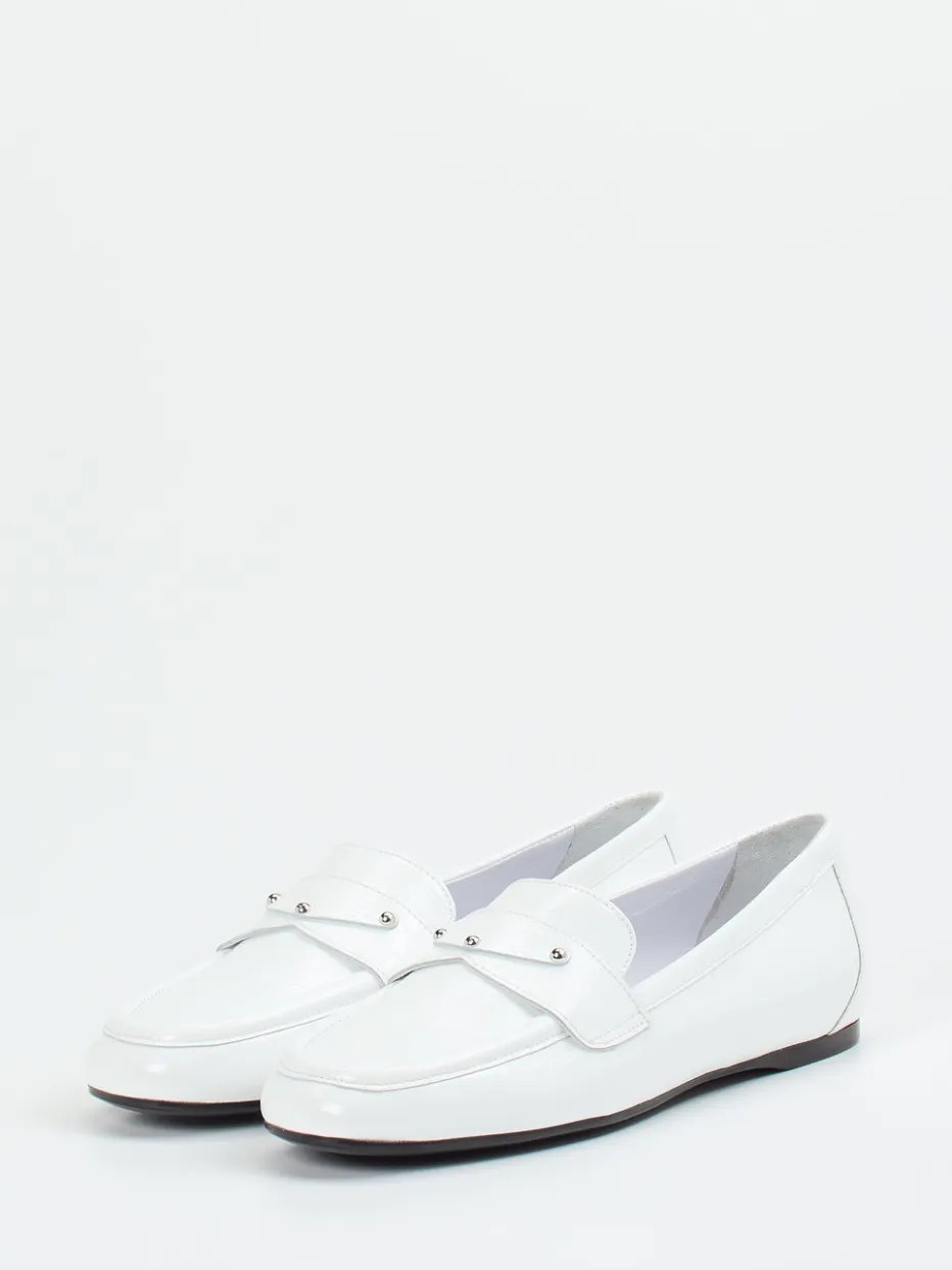 Dieser weiße Loafer vereint hochwertigen Glanz mit minimalistischer Eleganz. Silberne Details und flache Form machen ihn zur stilvollen Ergänzung für Büro- und Freizeitlooks.