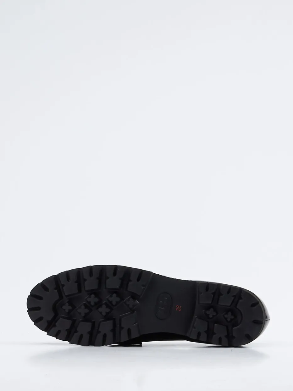 Hochglänzendes Lackleder und eine markante Profilsohle verbinden klare Linien mit urbaner Aussagekraft. Dieser Damenloafer zeigt sicheren Stil zwischen Minimalismus und Streetwear.