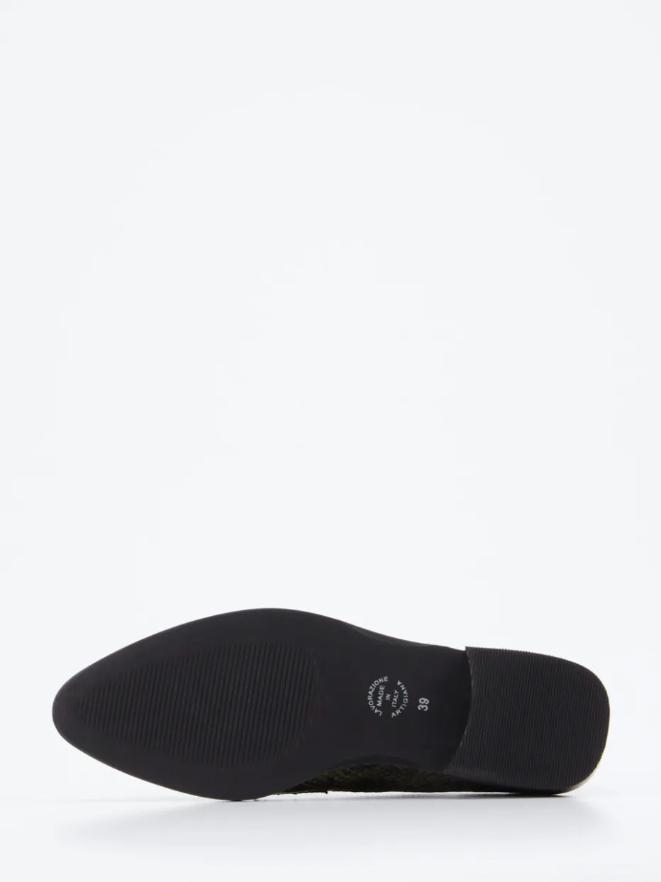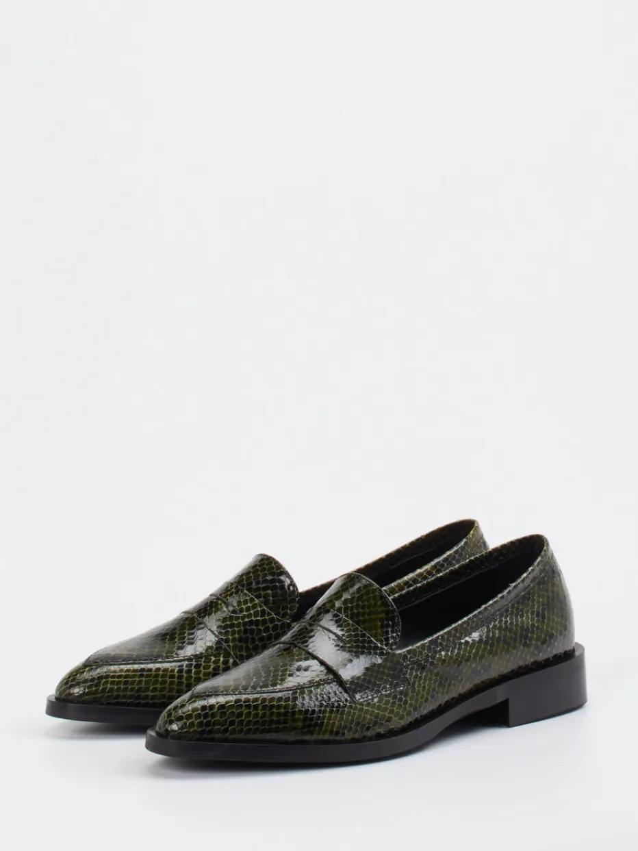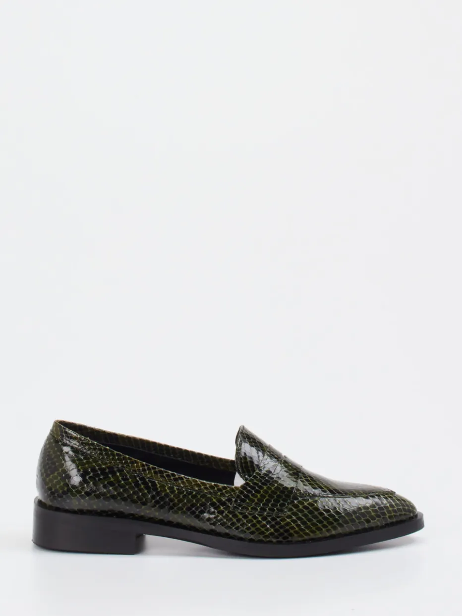 Der Loafer vereint glänzendes Lackleder mit markanter Schlangenprägung und einer eleganten Silhouette – ein stilistisches Statement für moderne Business- oder Alltagsoutfits.