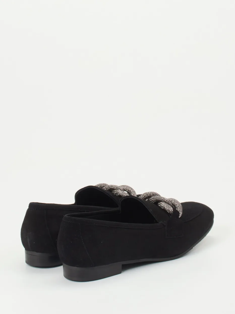 Formvollendete Schlichtheit mit wirkungsvollem Detail.Konstantin Starke zeigt mit diesem Damen-Loafer eine nuancierte Interpretation klassischer Eleganz. Ein schwarzes, samtig angeschliffenes Veloursleder verleiht dem Loafer eine matte, edle Oberfläche. Der kontrastierende Eyecatcher: eine dreigliedrige, silberfarbene Zierkette auf dem Blatt, stilistisch inspiriert vom „Quiet Luxury“-Trend. Die klar konturierte Silhouette mit flachem Absatz, die profilierte Gummisohle und das weiche Ziegenlederfutter bieten Komfort im Alltag wie im Büro. Dank der zeitlosen Farbgebung lässt sich dieses Modell mit schmalen Anzughosen oder Midi-Röcken kombinieren. Ein Statement-Piece mit klassischer DNA – präzise gefertigt für anspruchsvolle Looks.