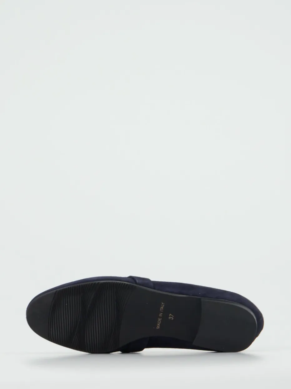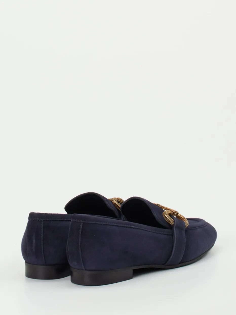 Ob im Büro oder in der Freizeit – das dunkelblaue Veloursleder mit matter Oberfläche und samtiger Textur sorgt für einen souveränen Auftritt. Die goldfarbene Zierspange im Trensenstil setzt einen dezenten Akzent, der den Preppy Chic betont. Dank Gummisohle und Ziegenlederfutter bietet das Modell komfortable Laufeigenschaften. Der flache Absatz und die Schlupfform unterstreichen den Heritage-Look im Sinne des „Quiet Luxury“-Trends. Perfekt kombinierbar mit Kaschmirpulli und Leder-Tote.