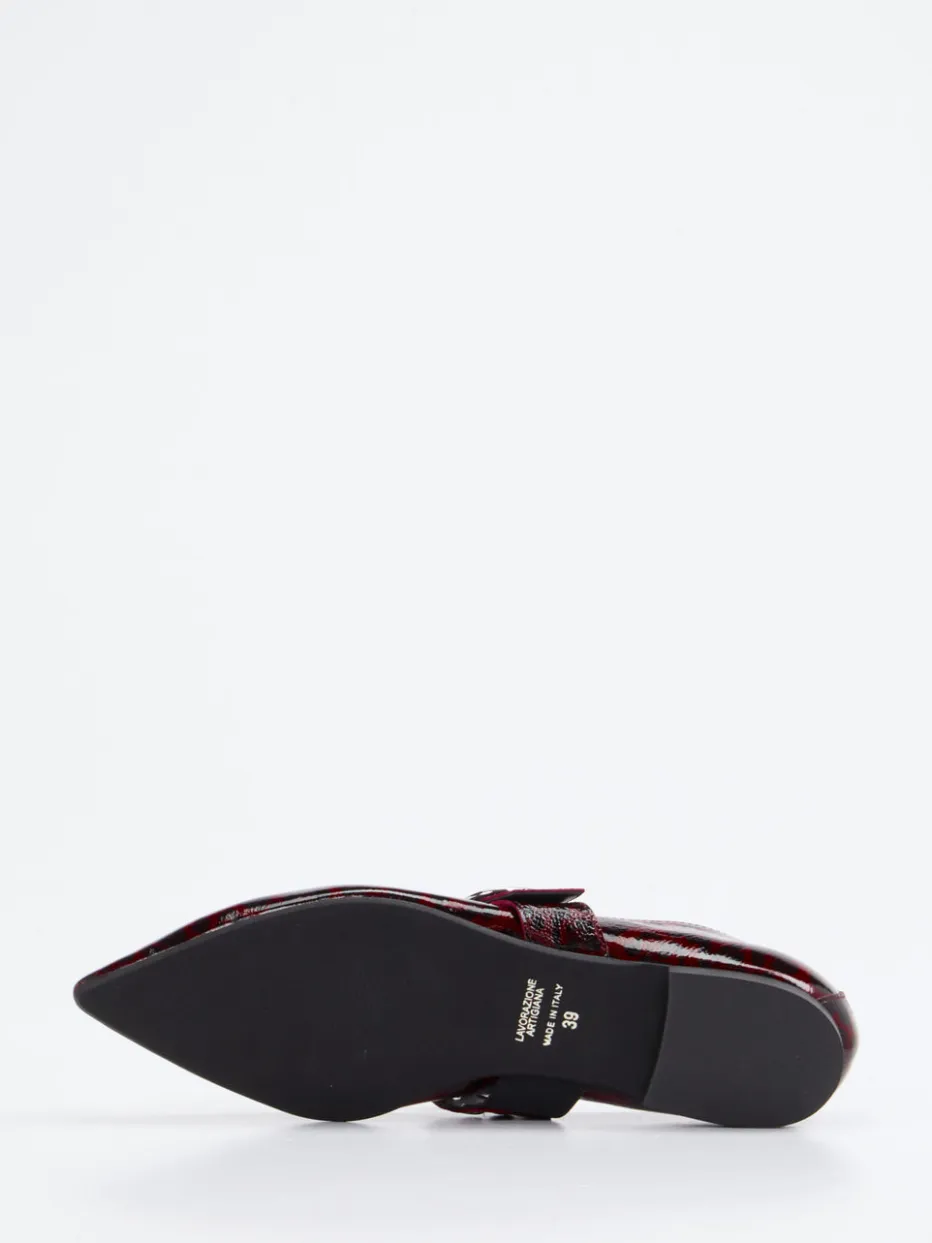 Trendige Mary Janes mit spitzem Leisten und glänzendem Lackleder in dunkelroter Animal-Optik. Silberfarbene Ösen und ein markanter Riemen setzen stilvolle Statements.