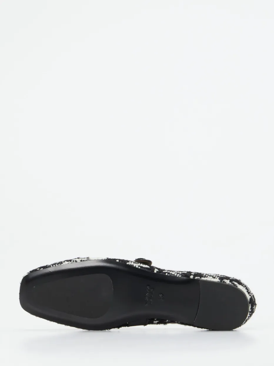 Modern interpretierter Vintage-Stil.Konstantin Starke interpretiert die klassische Ballerina unter nostalgischem Einfluss neu. Ideal für festliche Anlässe oder elegante Alltagskombinationen überzeugt dieses Modell mit strapazierfähigem Obermaterial aus grob gewebtem Bouclé-Textil im schwarz-weißen Karomuster. Der flache Aufbau mit leicht spitz zulaufender Form, kombiniert mit einem markanten Spannriemen aus schwarzem Kalbleder und tonigem Zierknopf, lässt französische Chic-Referenzen erkennen. Die Innenausstattung ist vollständig aus weichem Kalbleder gearbeitet, während die Lederlaufsohle mit Gummieinsatz Sicherheit im Alltag bietet. Die dezente Chanel-Ästhetik und der Bezug zum