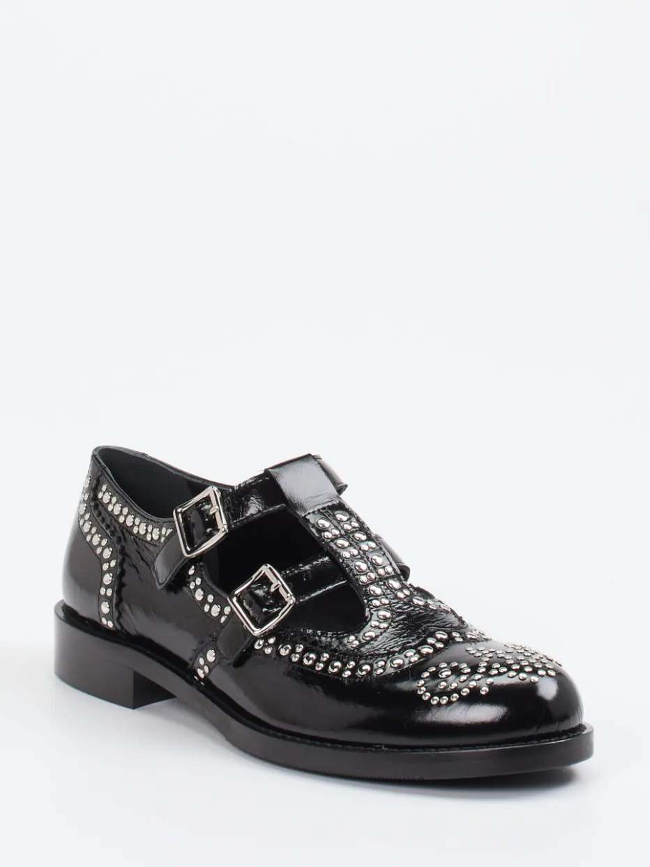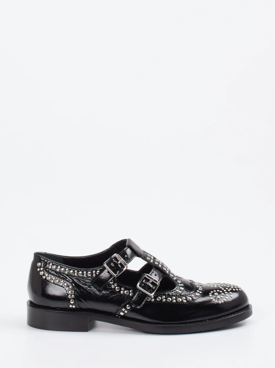 Ob beim Stadtbummel oder abends im Szeneviertel – das hochglänzende Lackleder in tiefem Schwarz bietet eine elegante Grundlage mit rebellischem Touch. Silberfarbene Nieten und doppelte Schnallen setzen auffällige Akzente. Die flache, rund zulaufende Form sorgt dabei für Komfort, der durch die rutschfeste Gummisohle unterstützt wird. Stilistisch vereinen sich Punk-Elemente und klassische Brogue-Anklänge zu einem Fashion-Statement mit Trendgespür. Ideal zu strukturierten Stoffen oder rockigen Lederjacken.