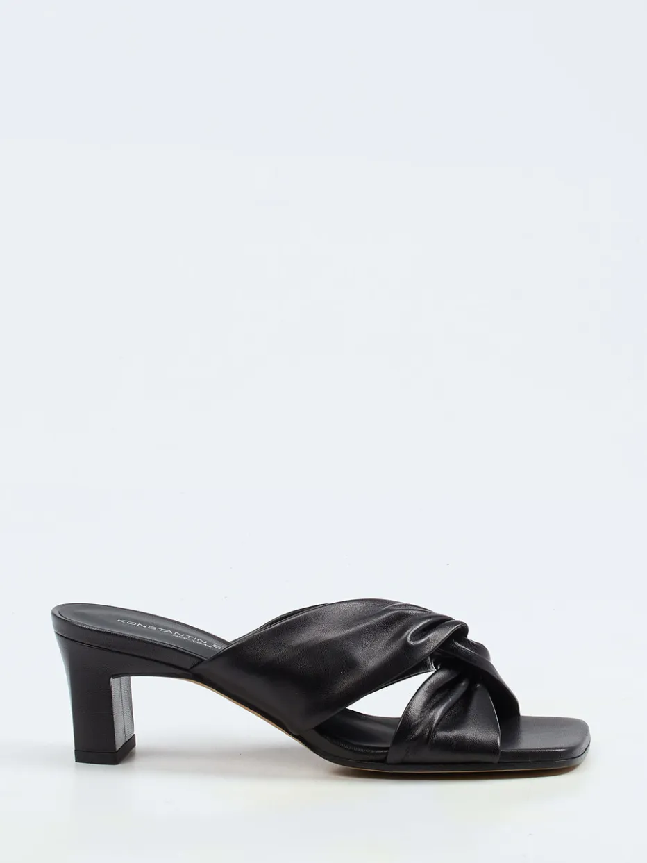 Schlichtes Design heißt das Motto bei dieser Pantolette aus dem Hause Konstantin Starke. Das schwarze Lammnappaleder ist besonders weich und angenehm zu tragen. Die lässig miteinander verschlungenen Riemchen bieten einen soften, aber sicheren Halt. Abgerundet wird der das edle Erscheinungsbild durch den modernen Carréleisten und den ausgefallenen, lederbezogenen Blockabsatz. Von innen leicht gepolstert unterstreicht die Ledersohle das angenehme Tragegefühl.