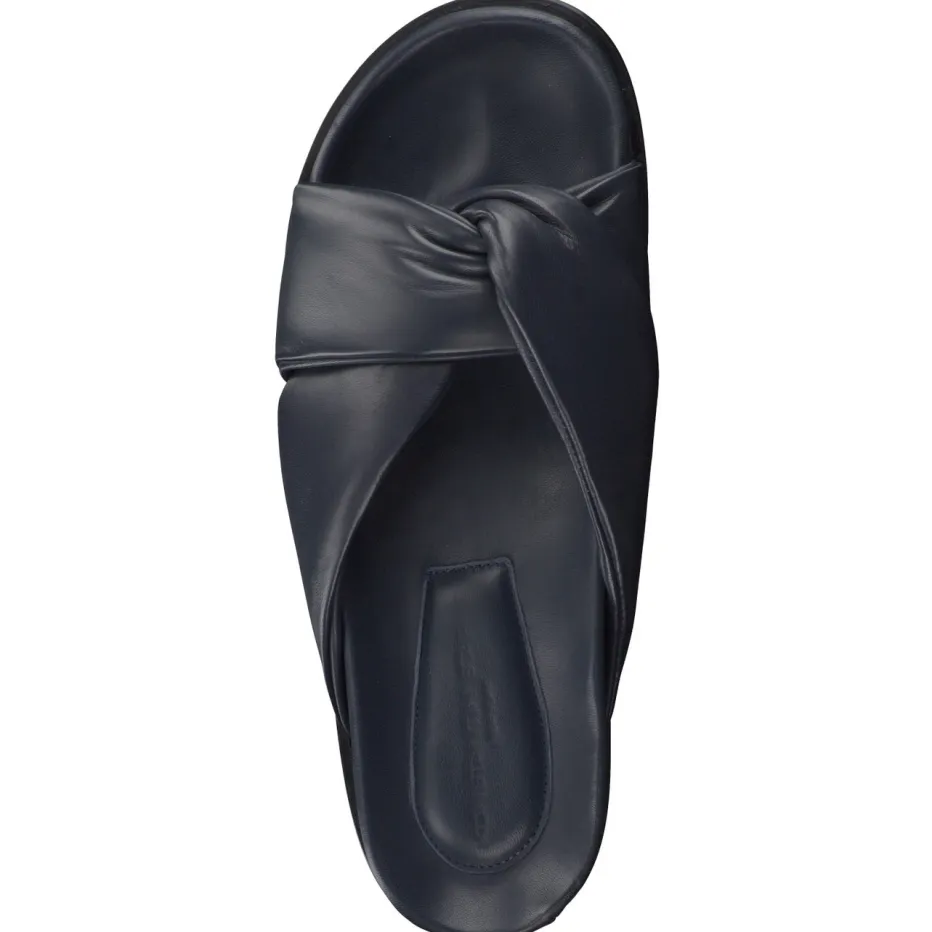 Attraktiv und modisch präsentiert die Marke Konstantin Starke diese Pantolette auf einem modernen Tieffußbett. Bestechend weich zeigt sich das dunkelblaue Lammnappaleder aufgrund der gepolsterten Riemchen, die auf dem Blatt gekreuzt miteider verbunden sind. Der Leisten ist besonders bequem. Die Ledersohle mit der Gummiintarsie unterstreicht die anspruchsvoll sommerliche Aussage.