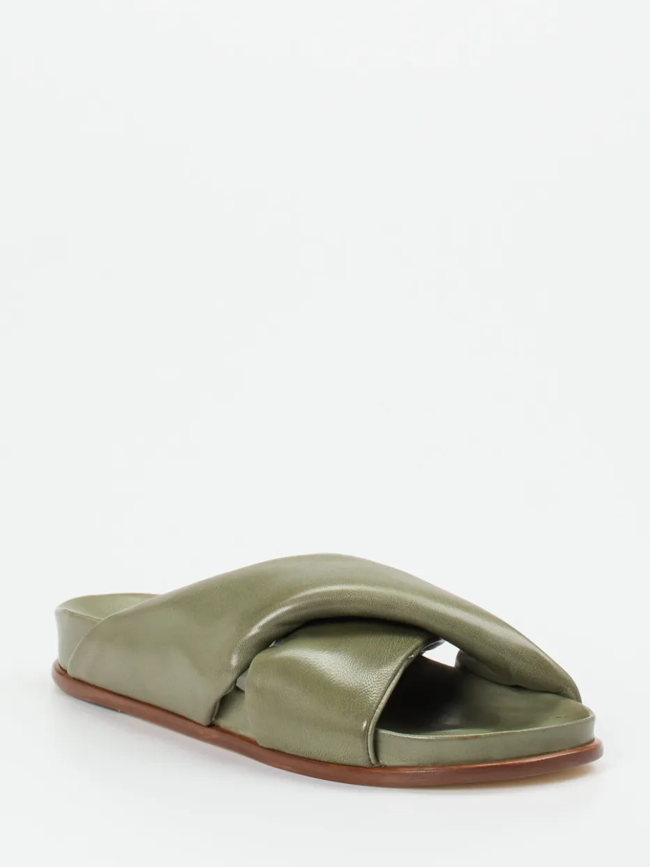 Sommer-Chic in neuer Leichtigkeit. Mit dieser Pantolette interpretiert Konstantin Starke die Kategorie Slides stilvoll neu. Ideal für warme Tage in der Stadt oder auf Reisen bietet dieses Modell hohen Komfort und modischen Minimalismus. Gefertigt aus weichem Lammleder in Salbeigrün wirken die überkreuzten, gepolsterten Riemen voluminös und edel. Das anatomisch geformte Lederfußbett und eine leicht erhöhte Sohle mit braunem Akzent sorgen für ein stimmiges Gesamtbild und angenehmes Tragegefühl. Der Look greift aktuelle Trends wie „Soft Volume“ und „Quiet Luxury“ auf. Kombinierbar mit Leinenhose und Oversized-Bluse. Feine Handwerkskunst trifft zurückhaltende Eleganz – für designbewusste Sommertage.